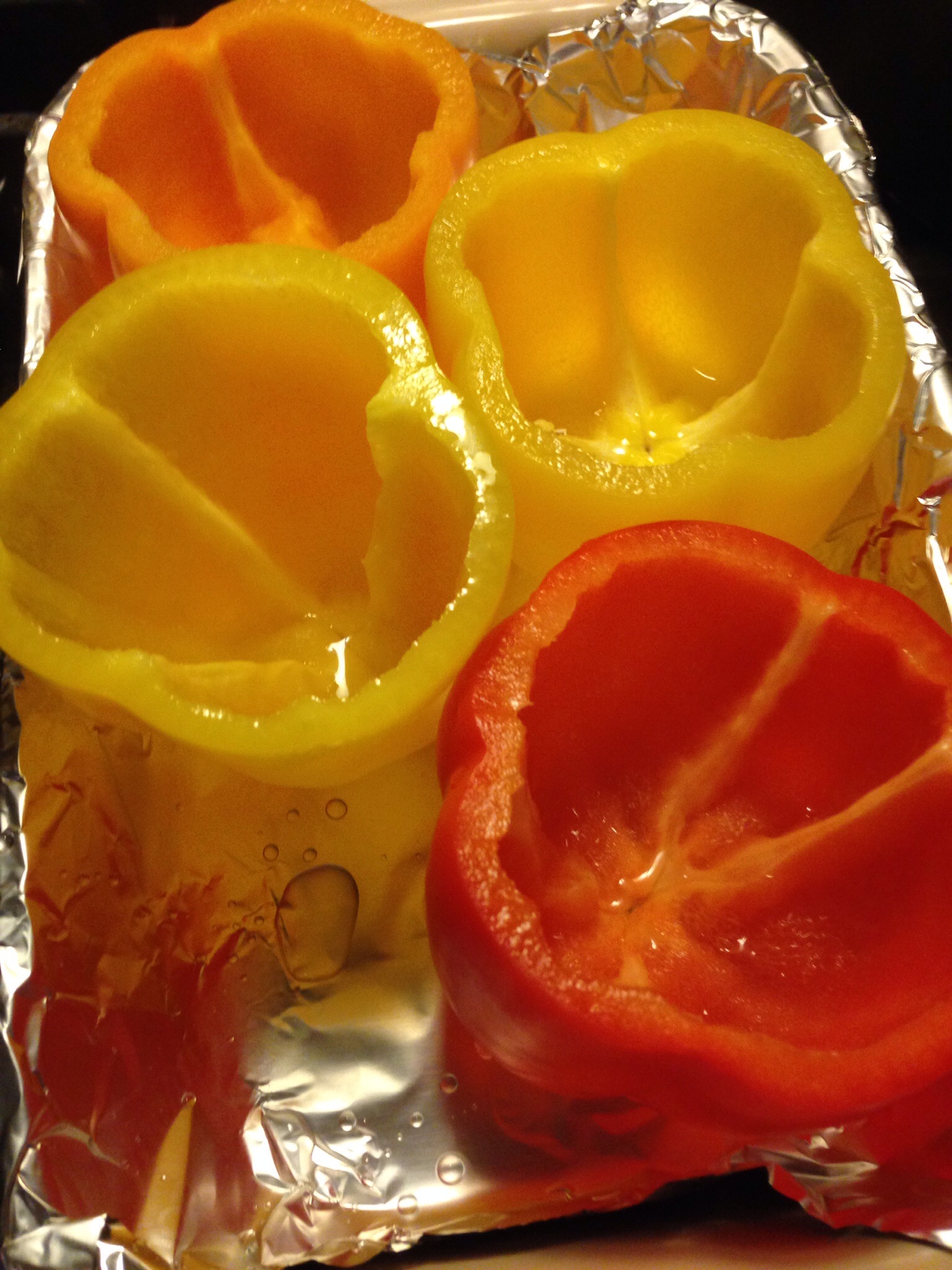 Cut off the tops of the peppers and remove the seeds. Par-boil the peppers in boiling salted water for 3-4 minutes. Remove and put the peppers in a casserole lined with non-stick foil. Preheat oven to 350.
