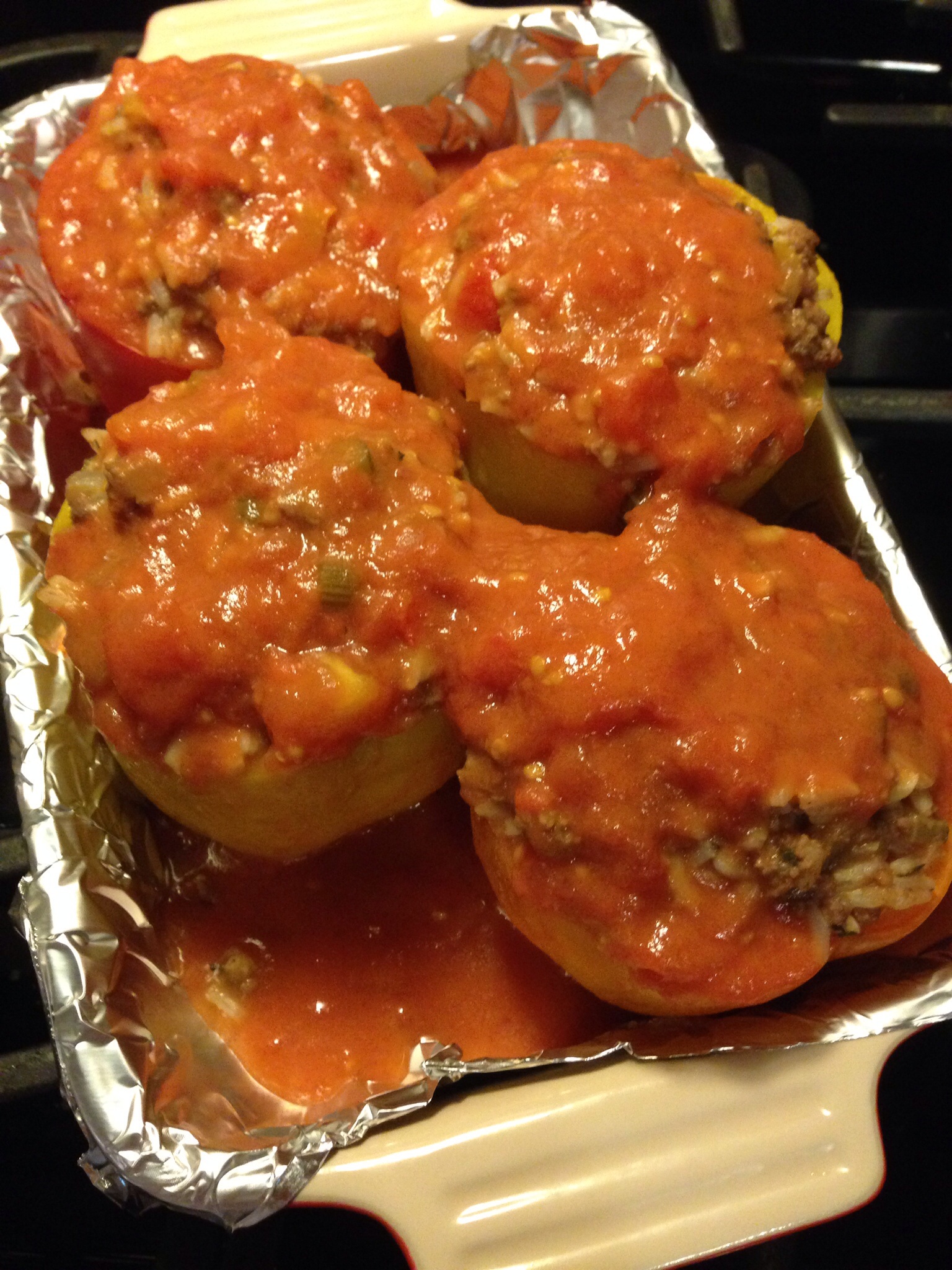 Cover with foil and bake for 15 minutes. Uncover and top with shredded mozzarella and bake for 15-20 minutes until cheese is melted and peppers are thoroughly heated. Plate peppers and top with some of the tomato gravy.