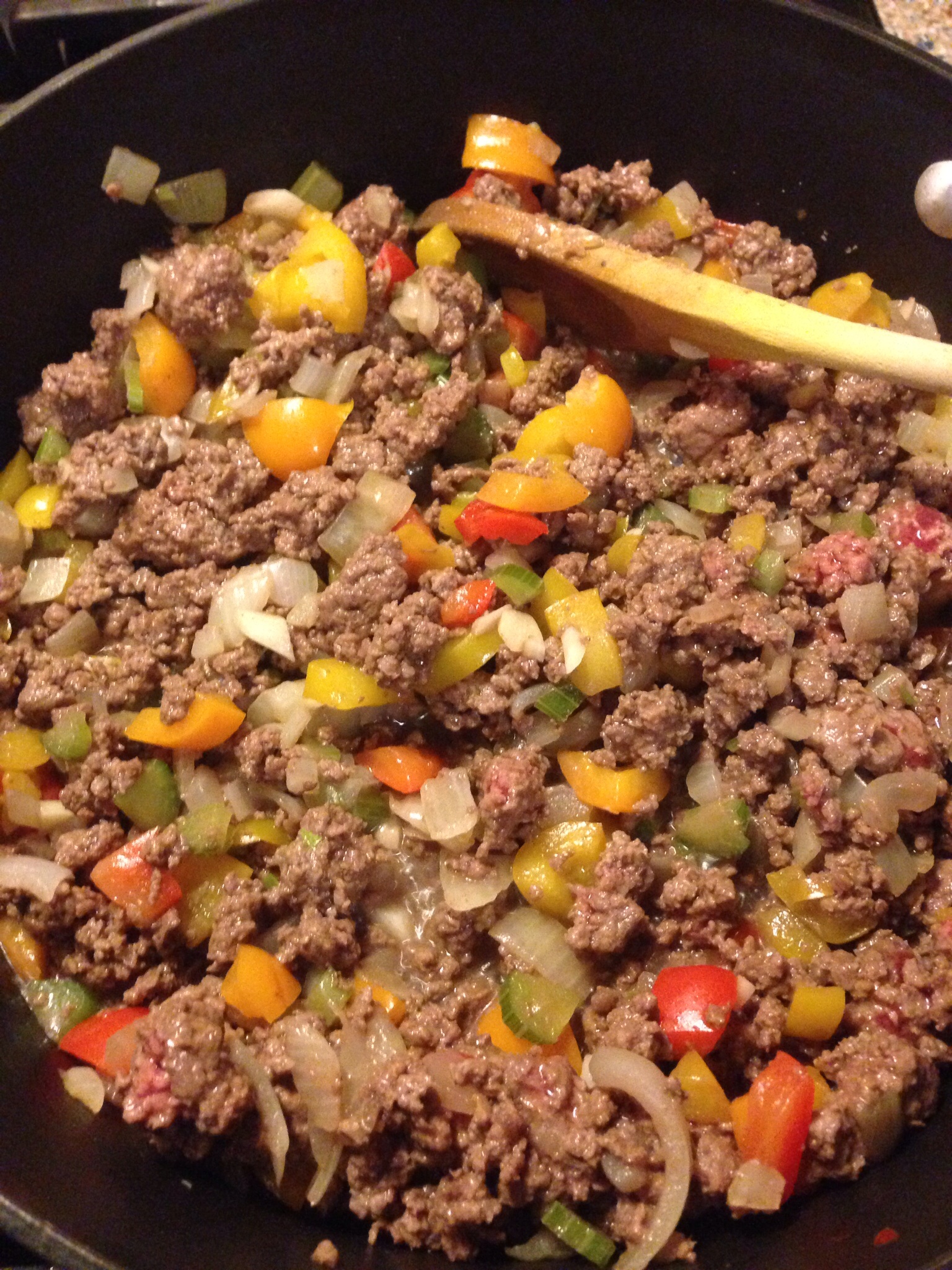 Sauté diced onion, pepper, celery and garlic for 3-4 minutes over medium heat. Add meat of your choosing and brown. Remove from heat. Stir in rice, seasonings, and asiago or Parmesan cheese.