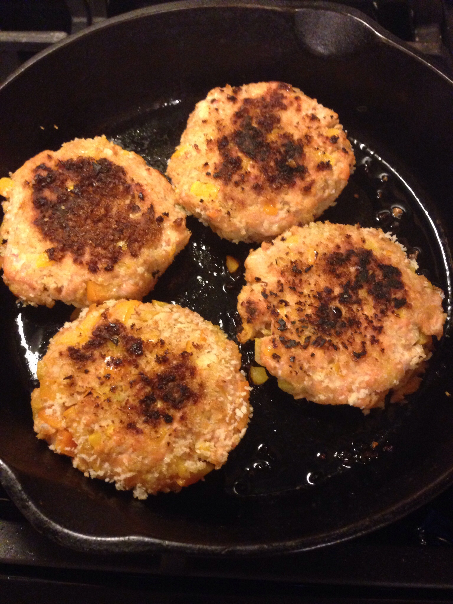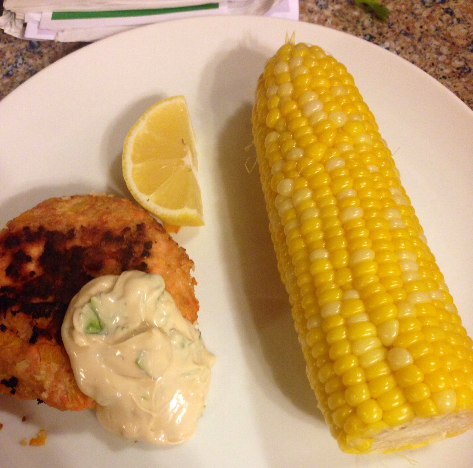 Do you remember salmon patties and creamed peas from your childhood? Actually I don’t. I don’t think we ever had salmon patties but almost everyone I know remembers them. And not necessarily fondly. I decided I wanted to give salmon patties a try. Minus the creamed peas. Corn on the cob instead.