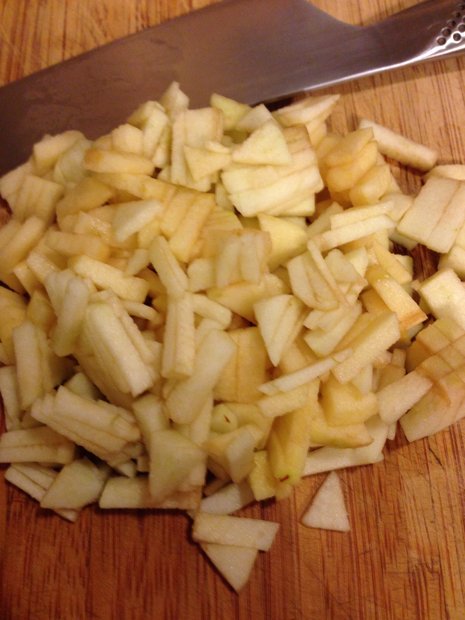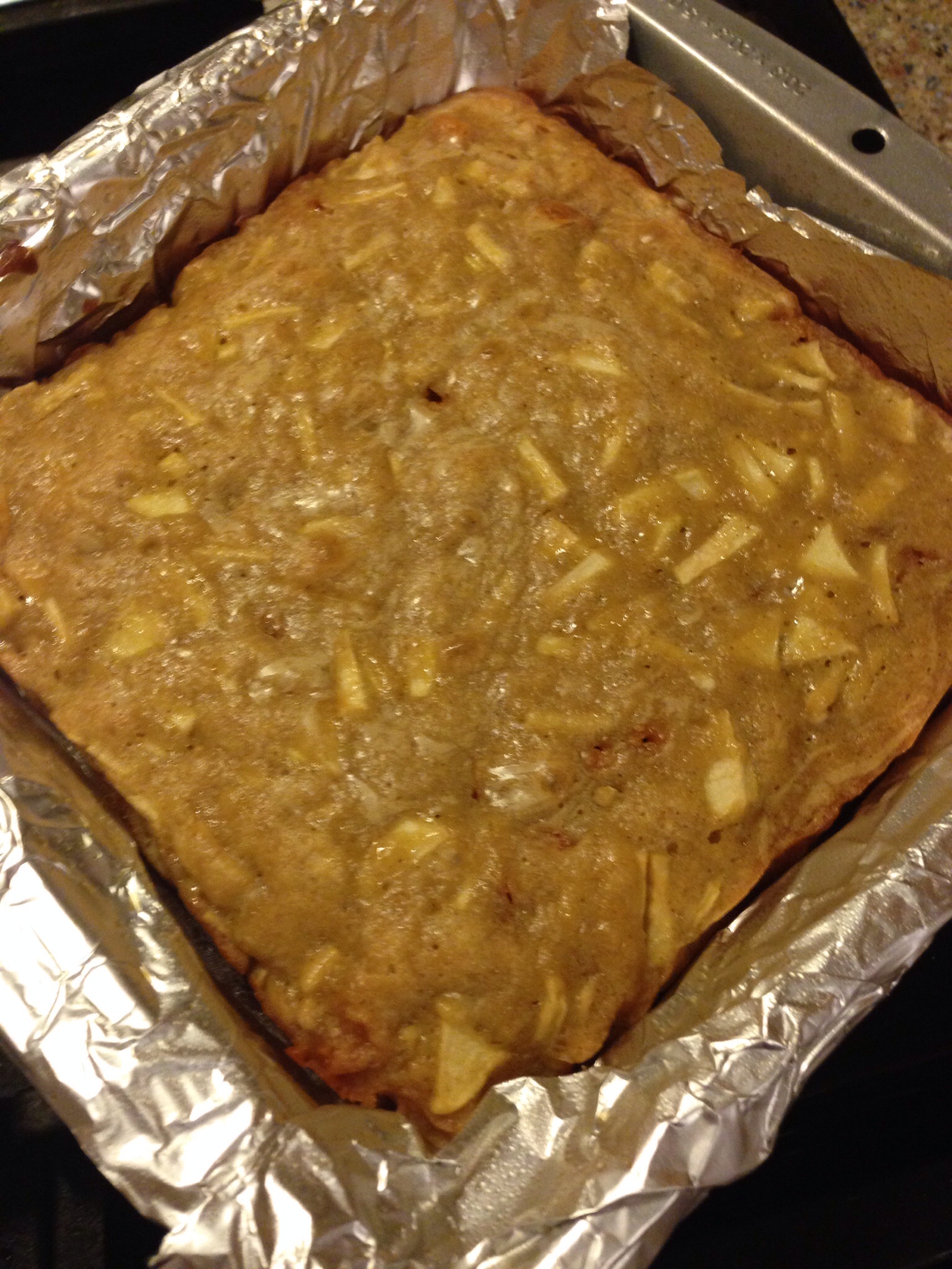 With the a rubber spatula mix in the dry ingredients (flour, salt and baking powder). Stir in the diced apples and butterscotch chips. Pour the batter into a 9″x9″ pan lined with foil. Bake for 25 minutes or until the top is lightly browned and the sides are set.