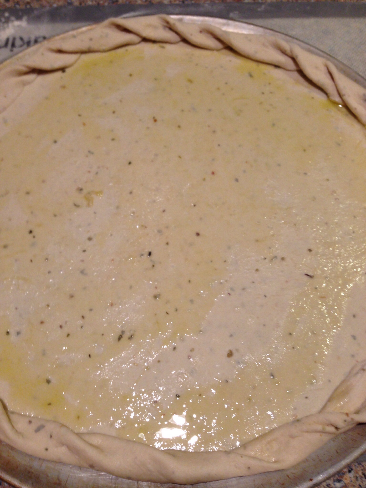 Once you roll the dough out place on a lightly greased pizza pan. Fold the edges over, lightly rub down with olive oil and pre-bake for approximately ten minutes. This helps to keep the crust from getting soggy.