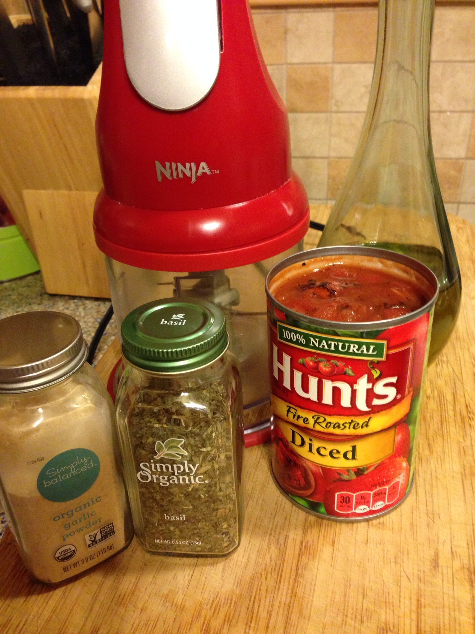 Blend the tomatoes, 1 T of olive oil and herbs to taste. Spread the sauce on your pre-baked crust.