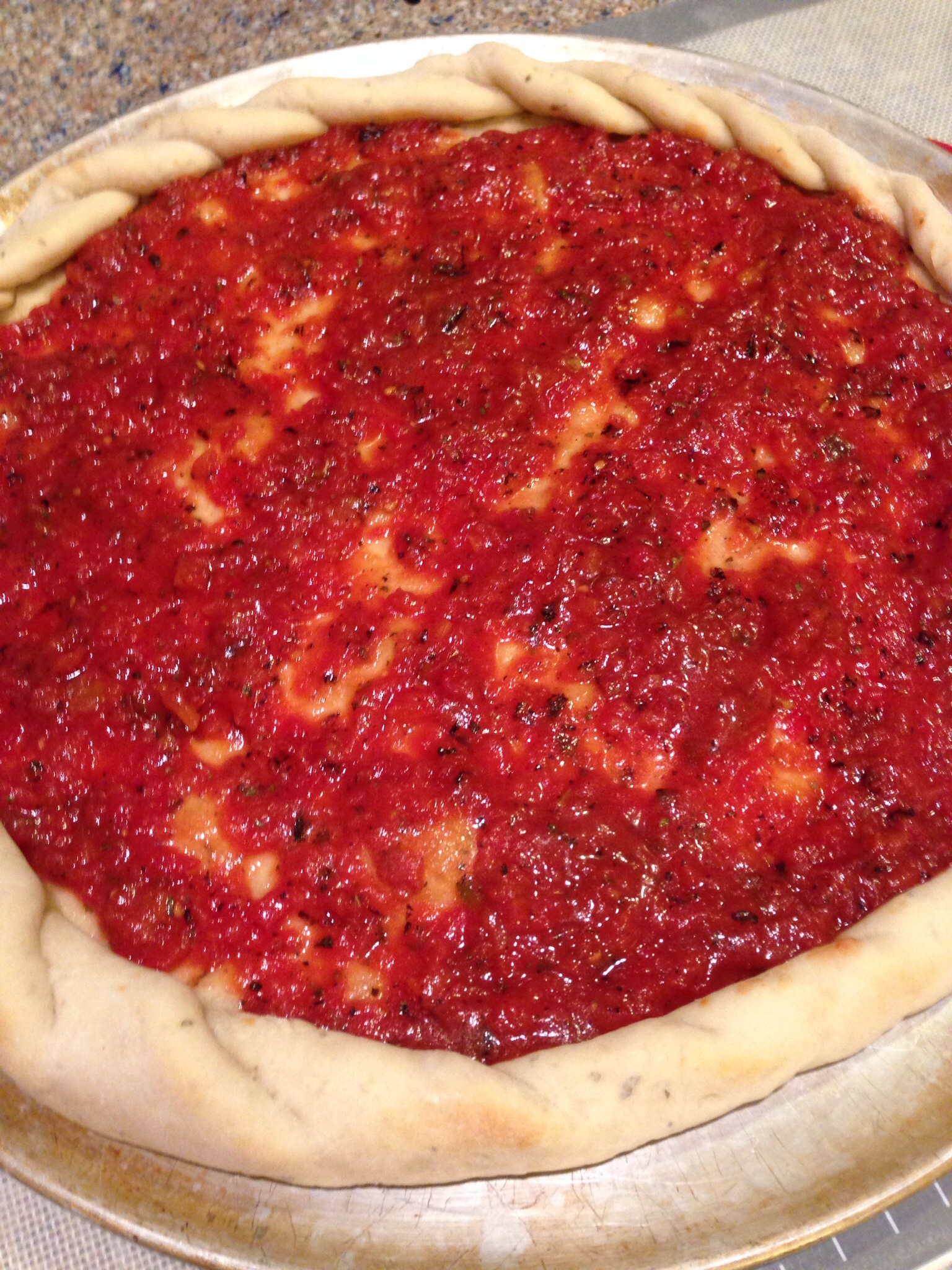 Now we are ready to top the pizza. There are many prepared sauces that you might like or you can use fire roasted tomatoes, a little olive oil, and some herbs.