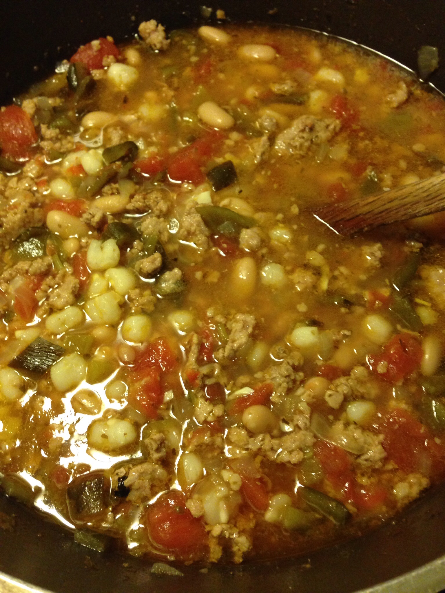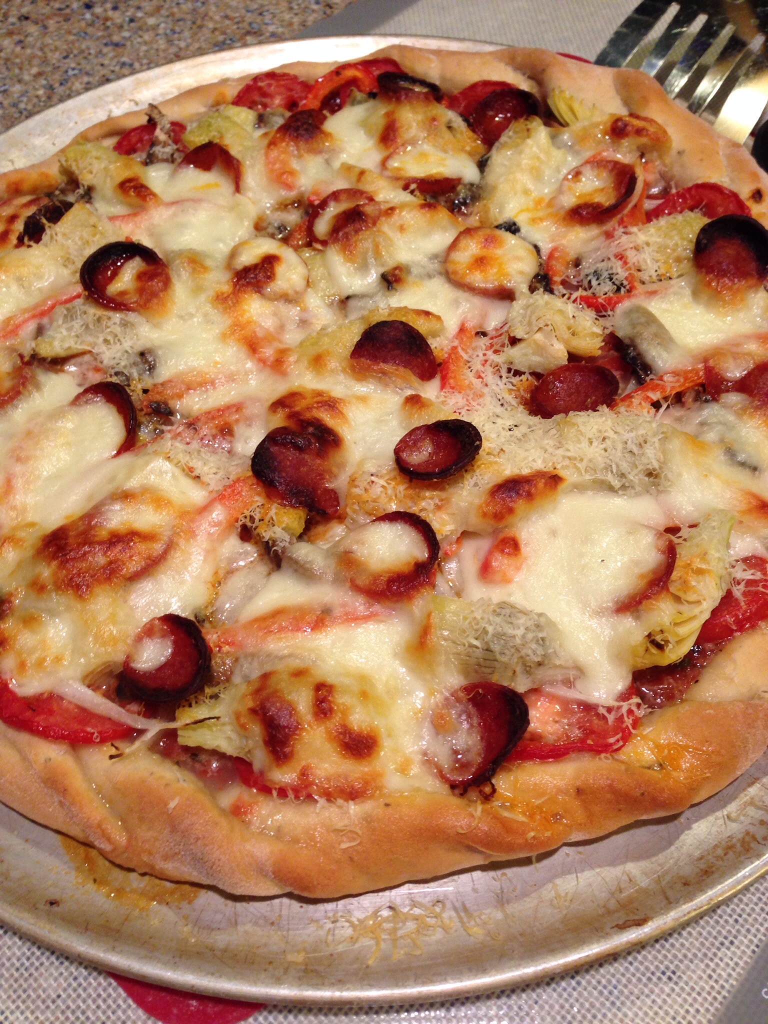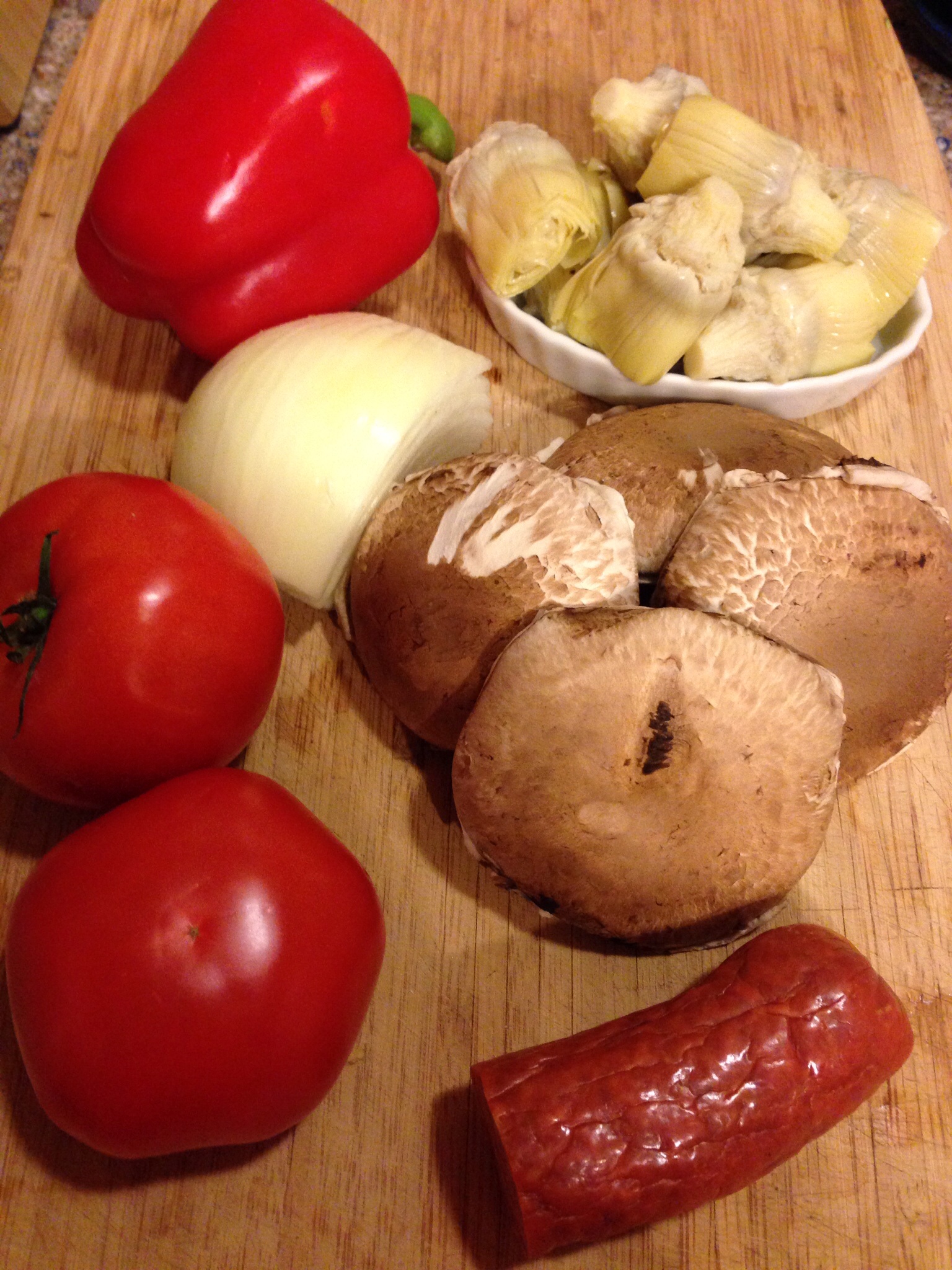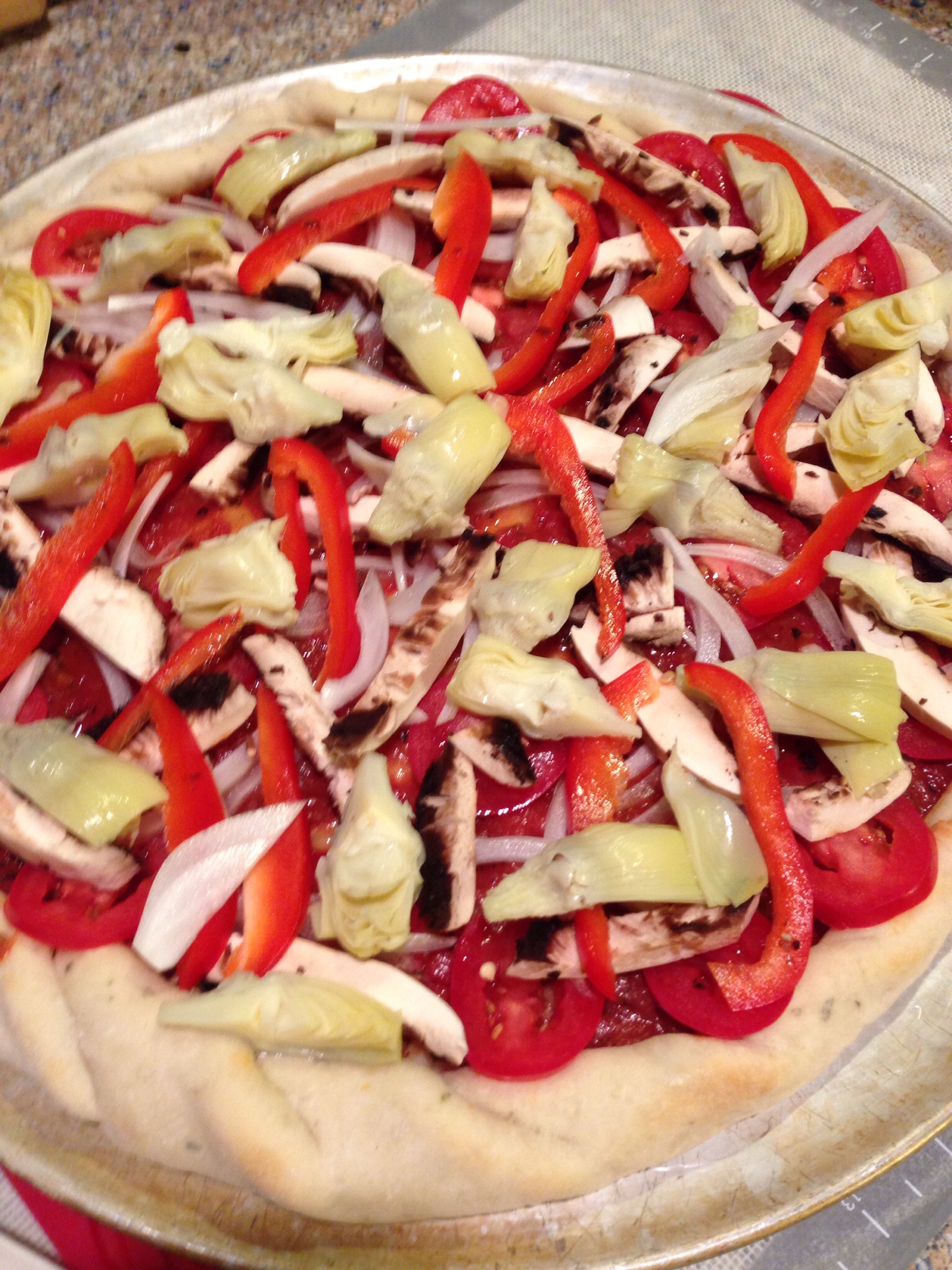 Choose your favorite toppings. Tonight I’m using onions, peppers, artichoke hearts, portabella mushrooms, tomatoes and some organic pepperoni.