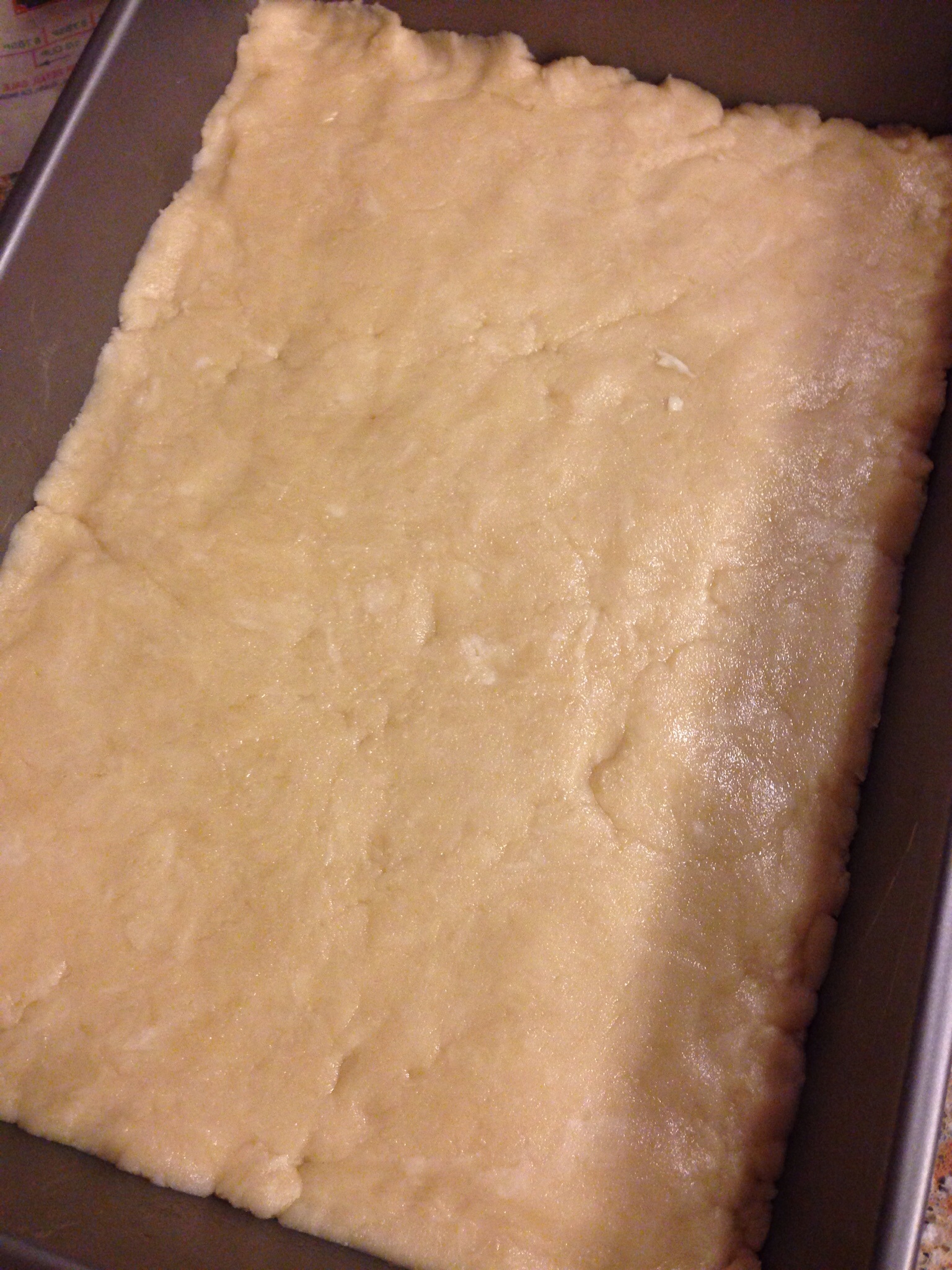 Add the melted butter and stir until combined. Put the crust into an ungreased 9×13 pan and, using your fingers, pat the crust down evenly. Bake at 325 for 20 minutes.