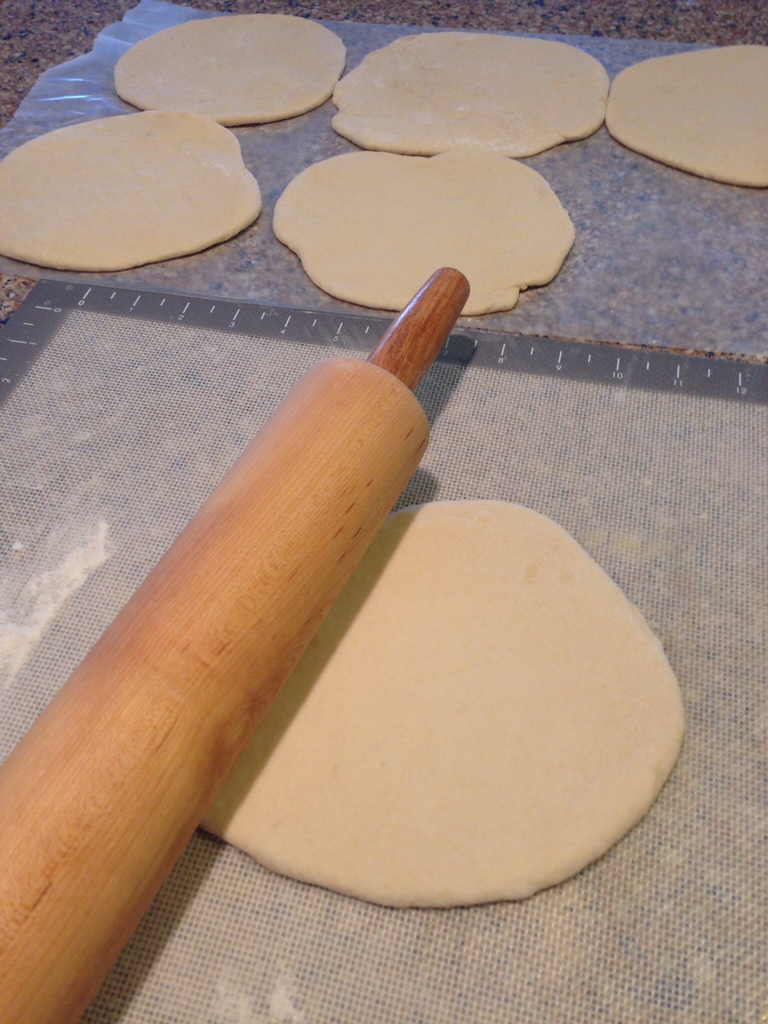 Divide the dough into eight pieces and roll each into a smooth ball. On a lightly floured surface roll each into a 9″ oval about 1/4″ thick.