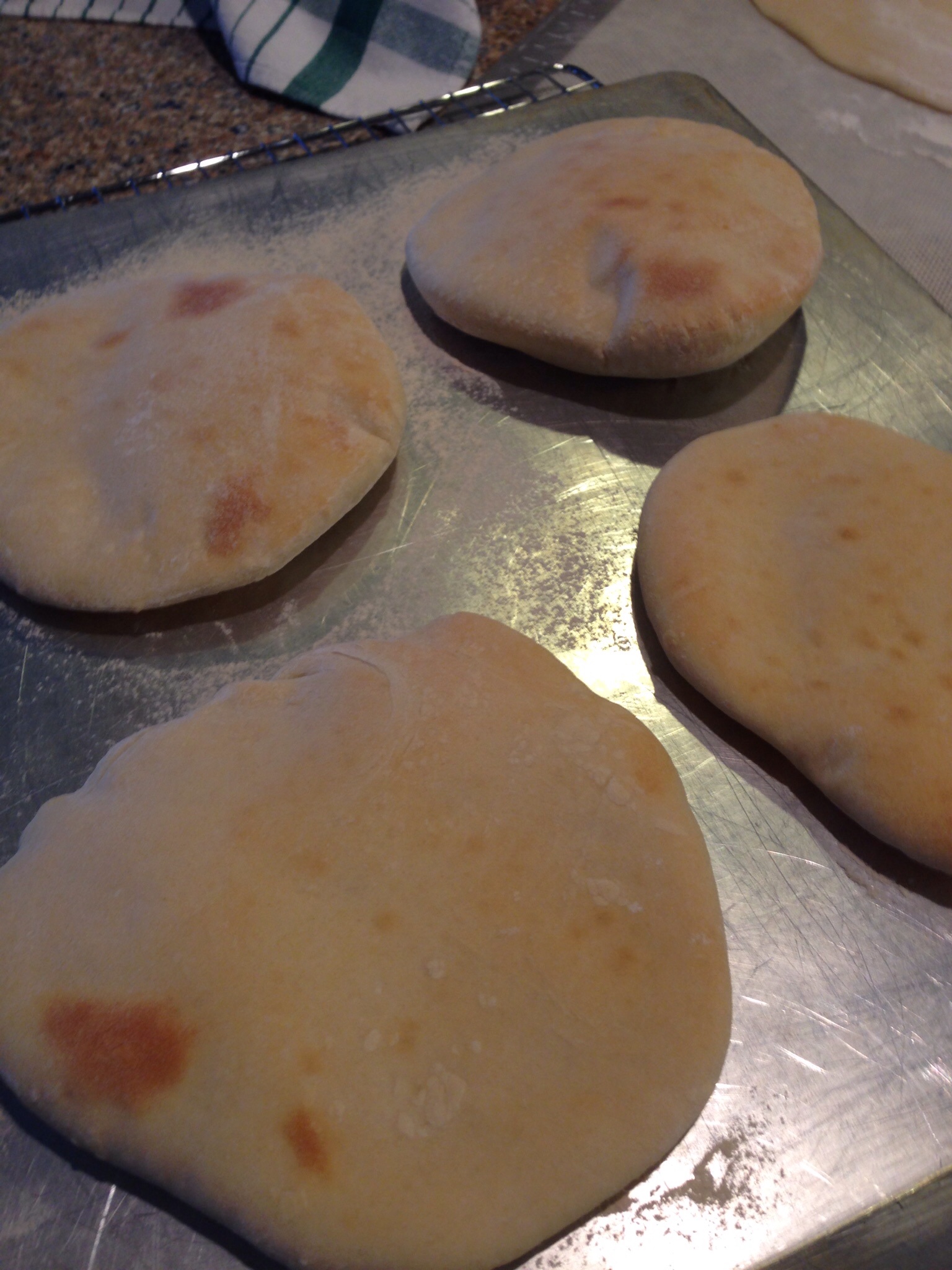 Cover the discs with the towel and proof until slightly risen, about 20 minutes. While the dough is proofing lightly dust two baking sheets with flour and preheat them in the oven for 5 minutes. Place the dough ovals on the hot baking sheets and return immediately to the oven. Bake for 5-10 minutes until puffy.