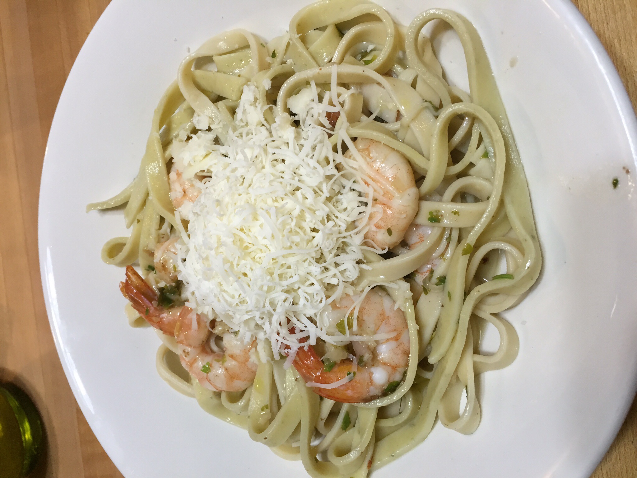 Sunday my friend and I had a great time making homemade pasta together. Tonight I used some of the pasta and made shrimp scampi for dinner. Lots of garlic, oil and butter. Probably not high on the healthy, low calorie meal pyramid. Definitely not a dish I grew up eating. As I think about it, I don’t recall ever eating shrimp or other shellfish as a child. We ate a lot of fresh water fish but no shellfish or ocean fish except an occasional cod filet at a Friday fish fry. I remember one time when my parents went out to dinner for what must have been a special occasion. One of them had ordered lobster for dinner and they brought home the lobster shell to show us. I remember being fascinated and a little repulsed and wondered how someone could possibly eat that creature!