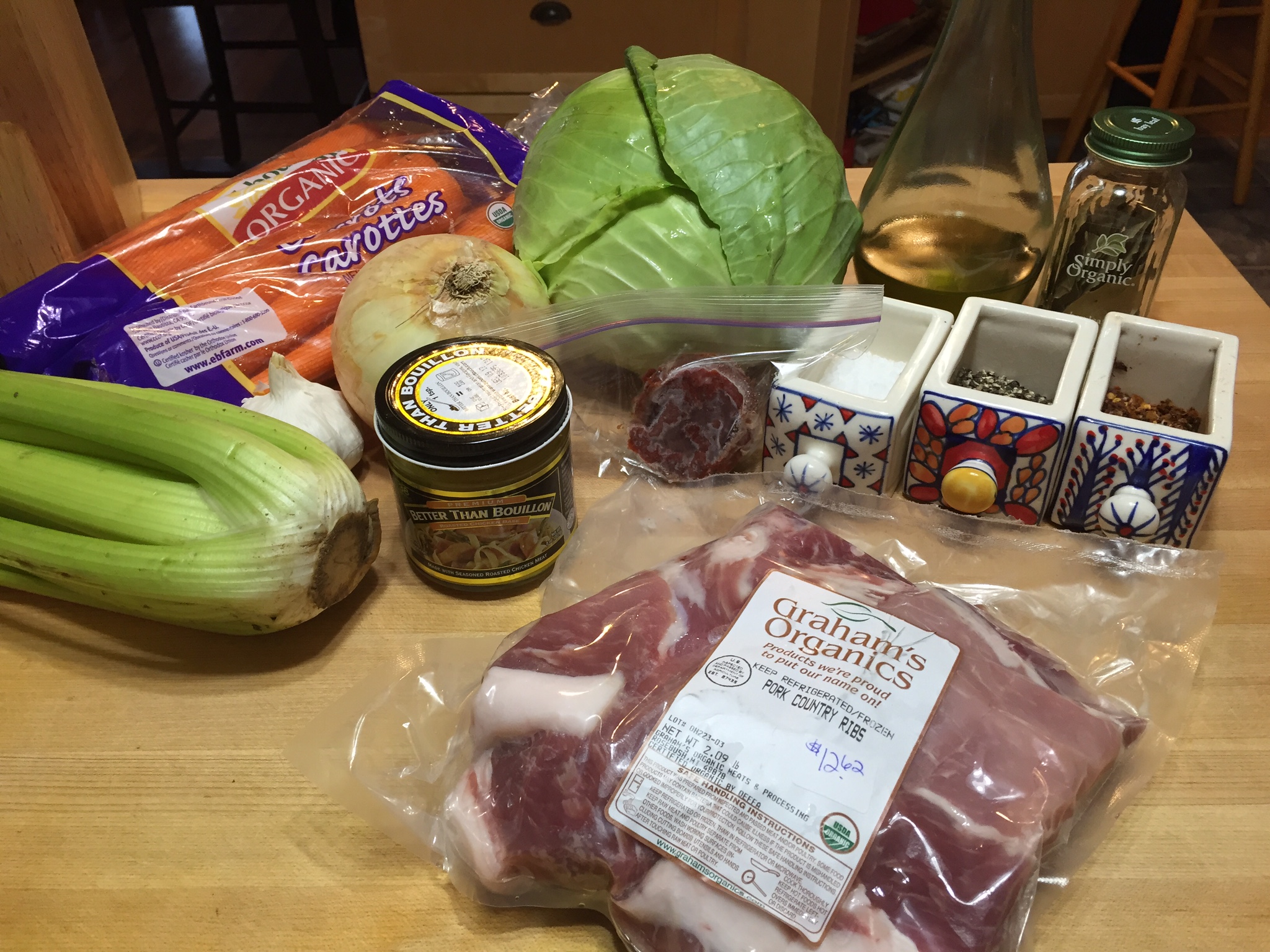 This is a Dutch oven dinner. I have several Dutch ovens in varying sizes and shapes and I love cooking in them. The cast iron provides perfect even heat, they go from stove top to oven to table, and clean up is pretty easy. Very often, when we think ribs, we think barbecue. I do love country style ribs barbecued but this is a good change of pace. A very homey, cold weather, comfort meal like your mother or grandmother would have put on the table. And it makes the kitchen smell wonderful when it’s cooking. One of my Dad’s favorite meals is a boiled dinner and this dish has a lot of the same components.