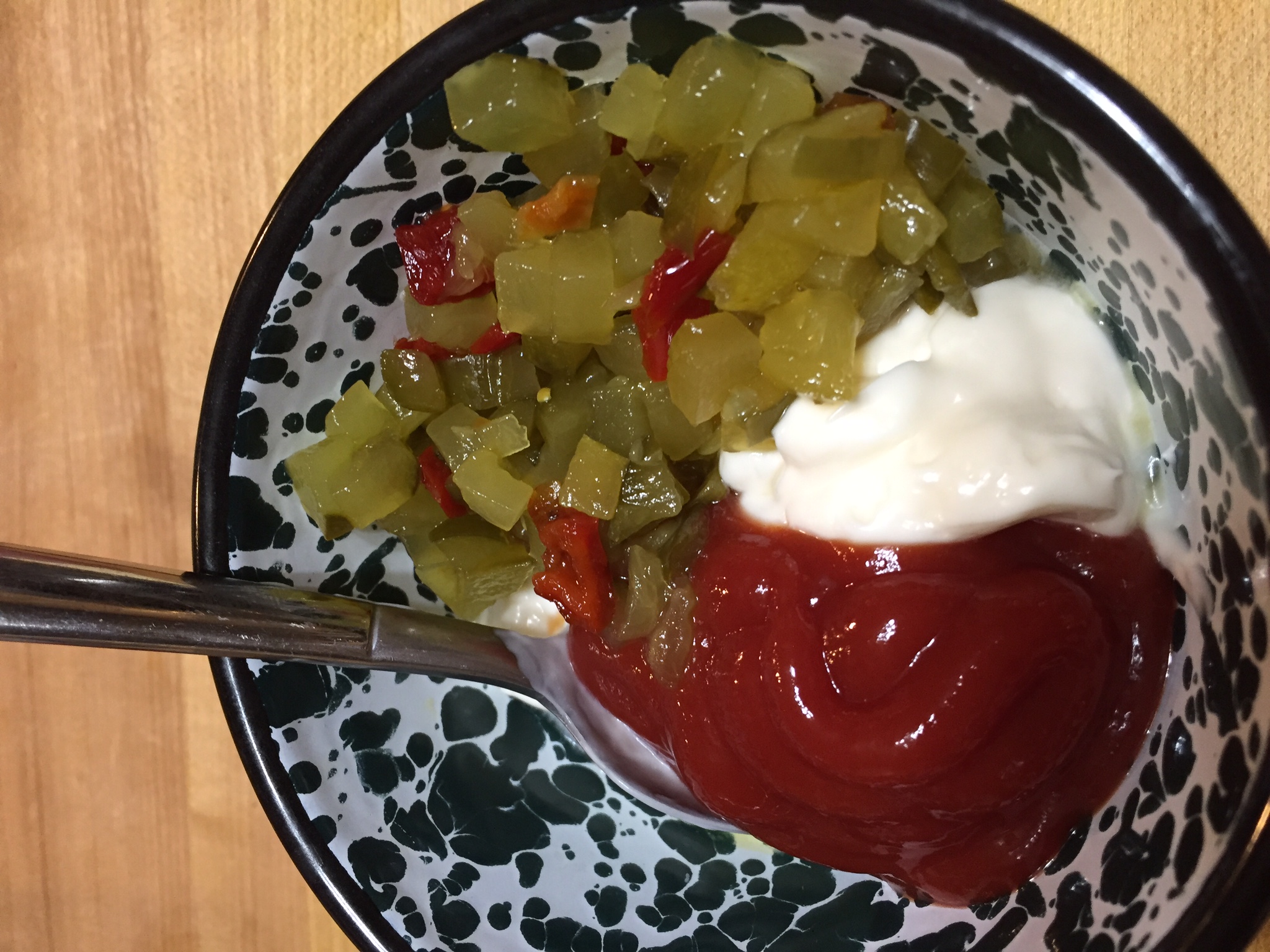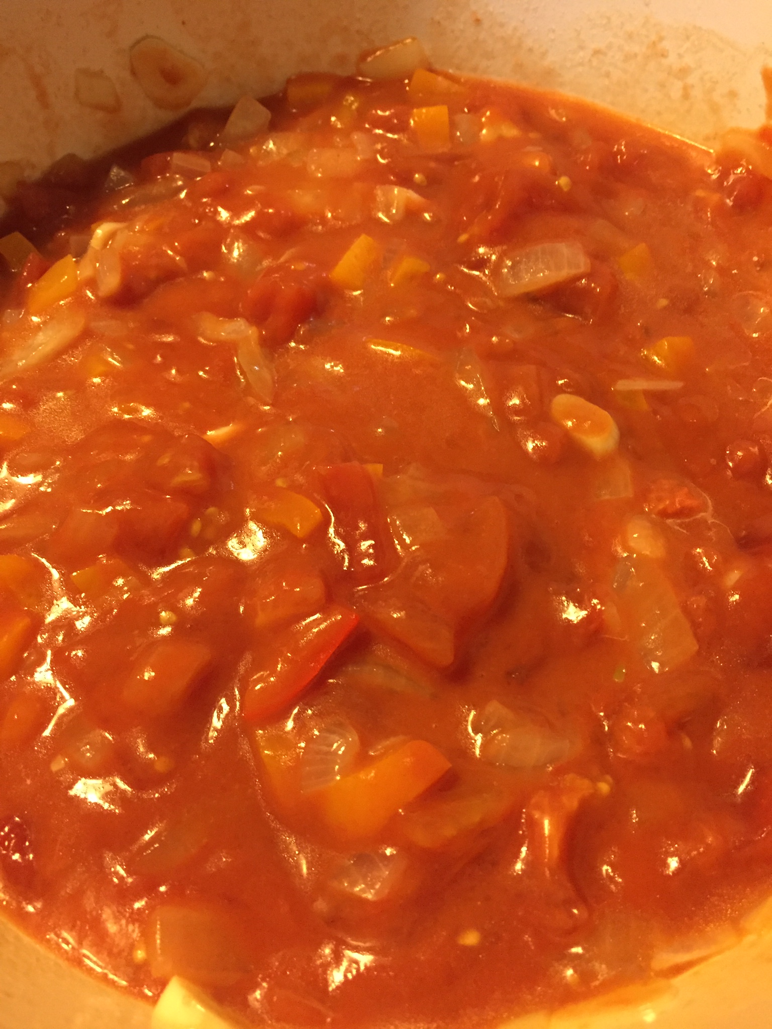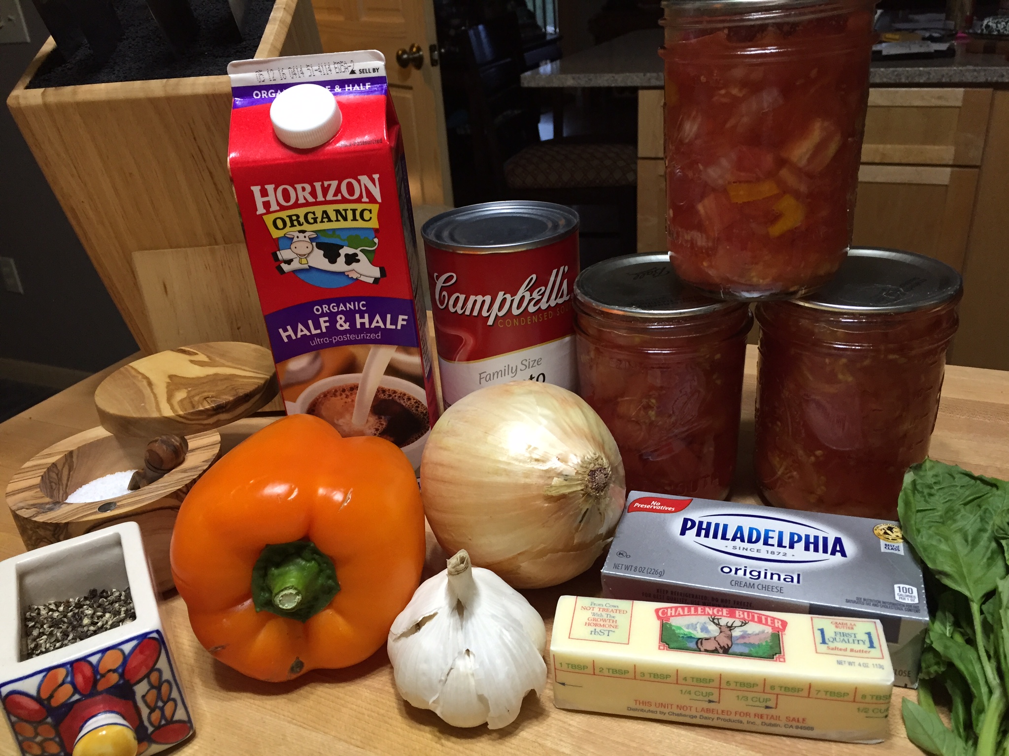This is a rich, tomatoey soup that is a big hit with almost everyone I’ve served it to. We all grew up eating Campbell’s tomato soup. When I was a kid, long long ago, on Saturday nights we often had tomato soup with popcorn in it. It’s actually a very good combo. I saw a recipe a while back for tomato popcorn soup in an issue of Food Network magazine. Of course they used popcorn with truffle oil and grated truffle percorino cheese but even so, they must have channeled my mother. I think our family had this because it was a very inexpensive dinner that went a long way. Truffle oil and truffle percorino would have defeated the purpose. Plus the little general store in my hometown carried neither. This soup recipe also uses a little Campbell’s but it’s the add-ins that make it so amazing. The recipe originated from a bar-restaurant in Jackson Michigan. I’ve modified it a bit by adding red or orange bell pepper, fresh garlic, and fresh basil. I also use my home canned stewed tomatoes but good store bought stewed tomatoes work great.