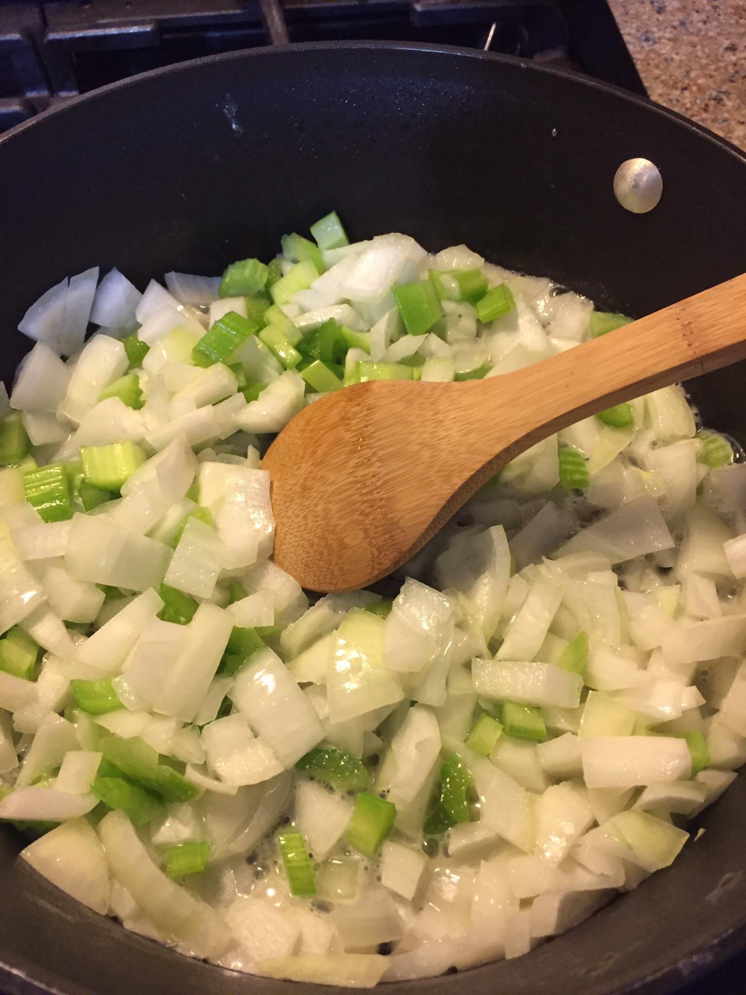 Melt the butter in a Dutch oven or heavy kettle over medium high heat and add the onions and peppers. Cook until they are tender, stirring occasionally, for about 5 minutes. Add the garlic and cook an additional minute or two until the garlic is fragrant.
