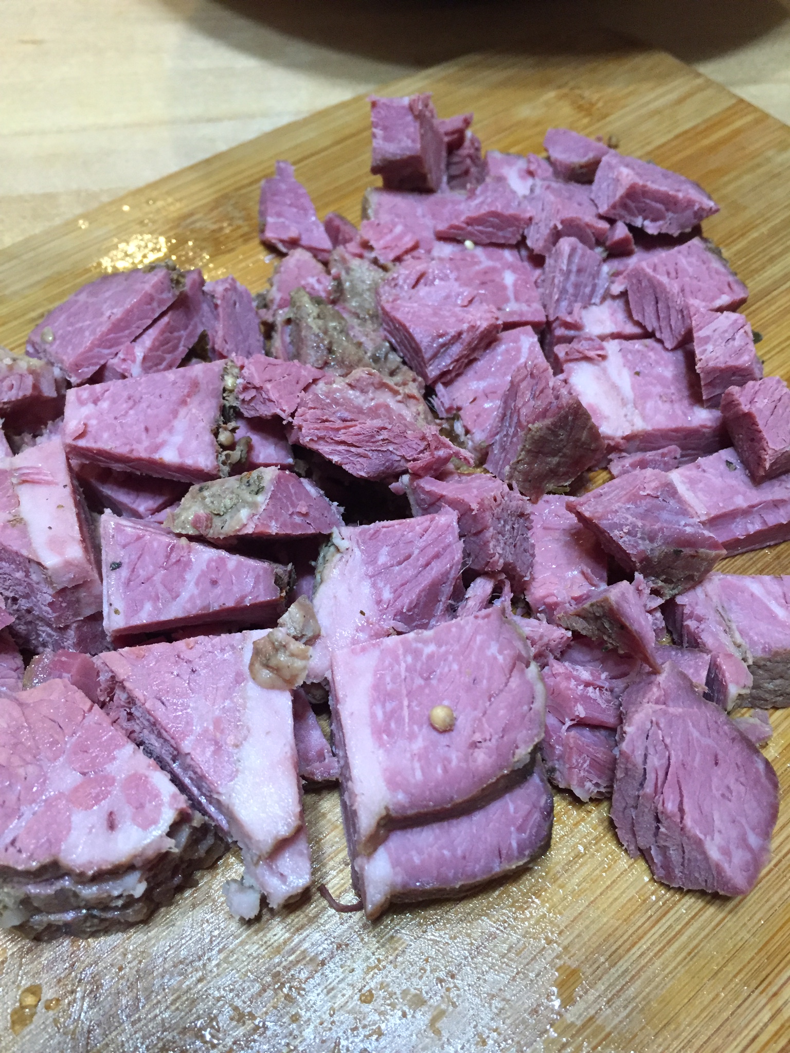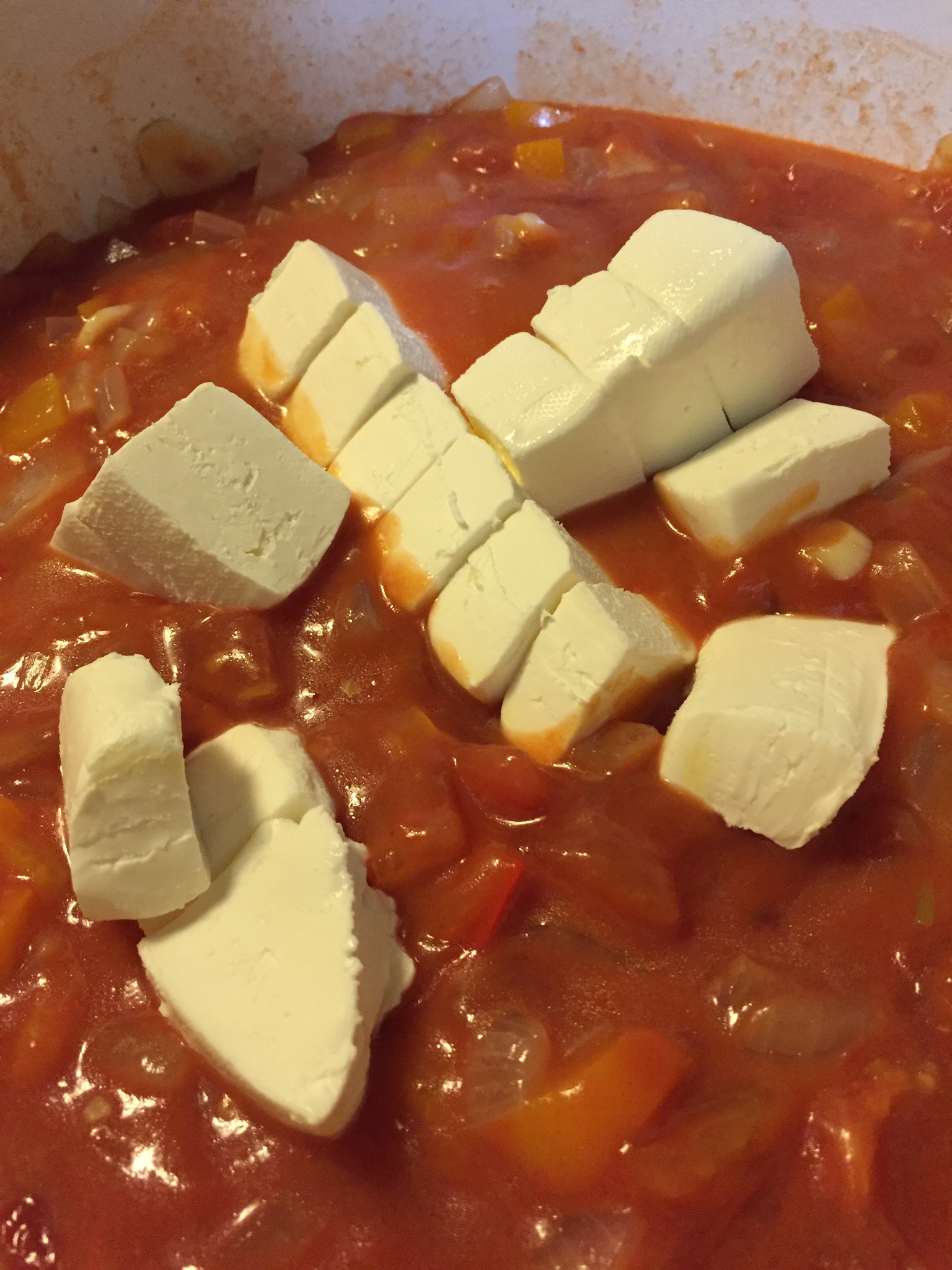 Reduce the heat. Stir in the tomatoes and tomato soup. Cube the cream cheese and add that to the tomatoes.