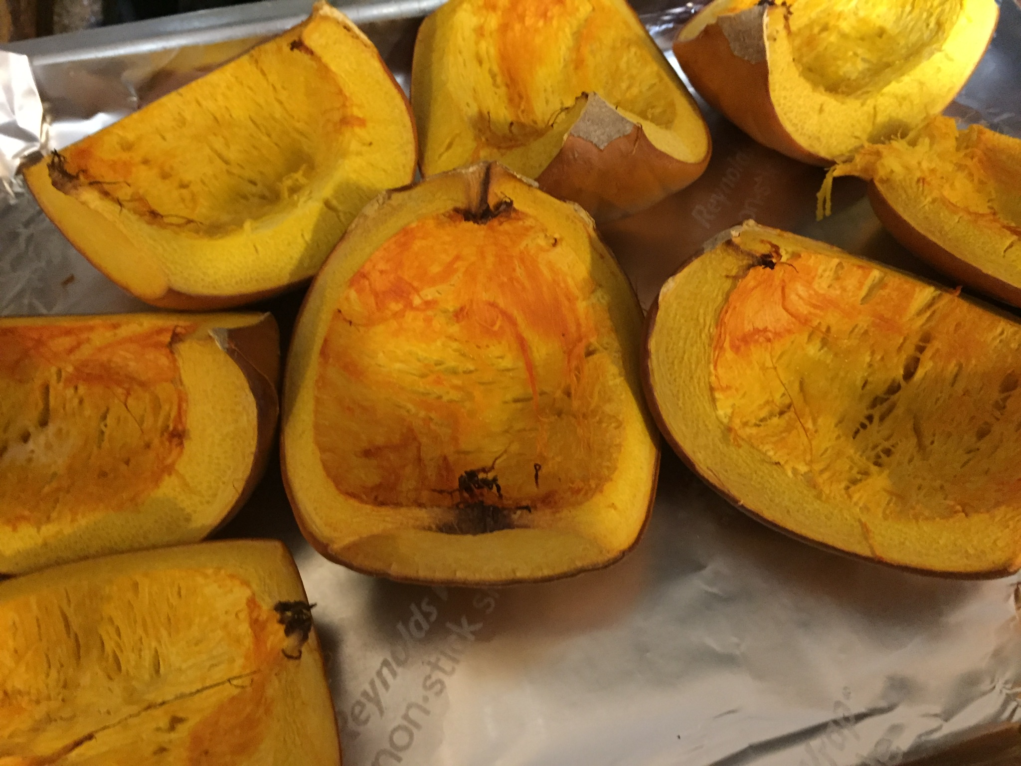 Quarter the pumpkins, scrape the seeds and arrange on a baking sheet lined with foil or parchment. Bake at 350 for 45-50 minutes or until fork tender. Once the pumpkin is done scrape the meat into a bowl and discard the skins.