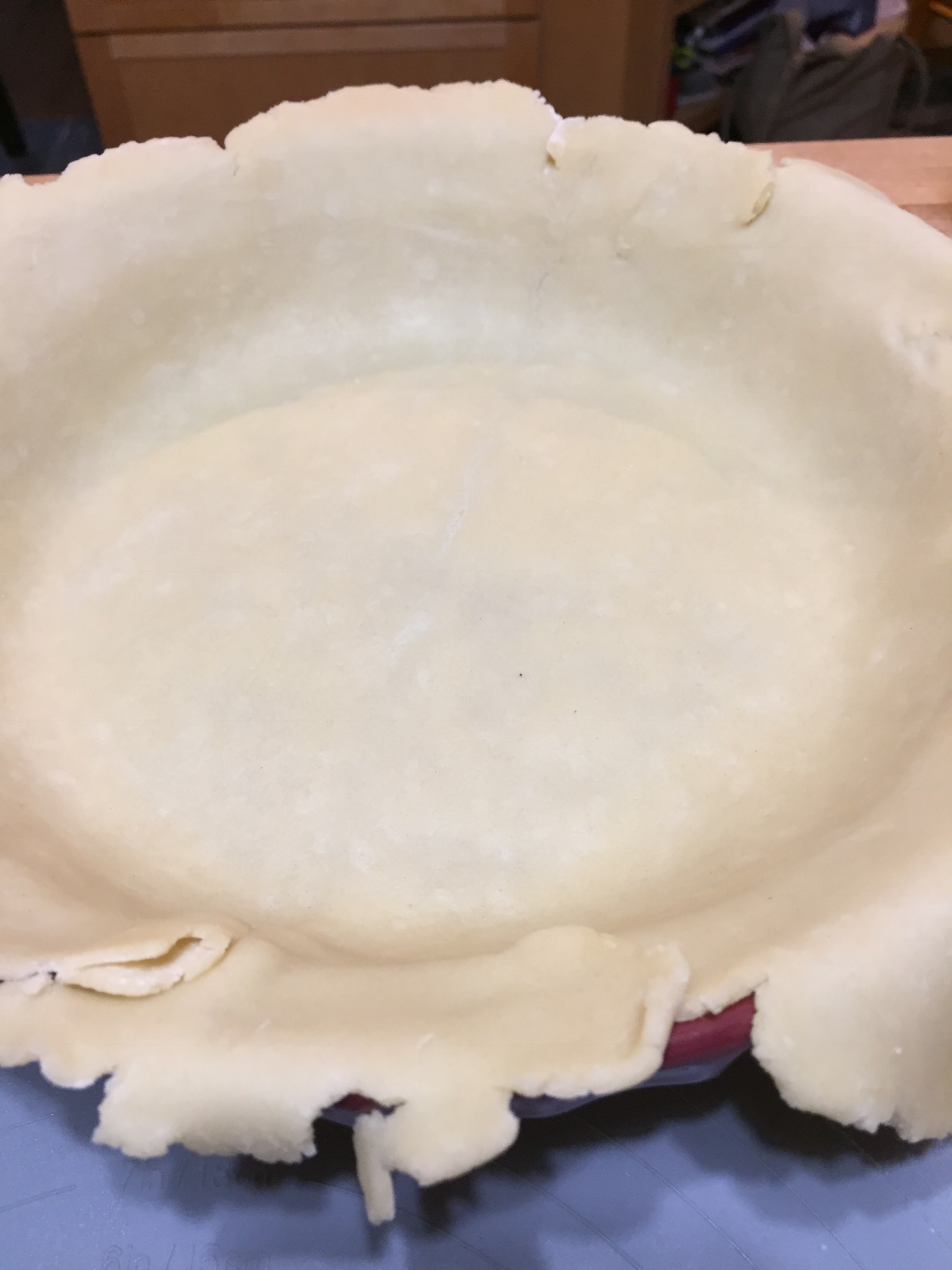 You might be able to get four crusts from this recipe but I give myself a little wiggle room for bad edges or other rolling difficulties. Roll the crust out on a lightly floured surface and line the bottom of the pie pan with the crust.