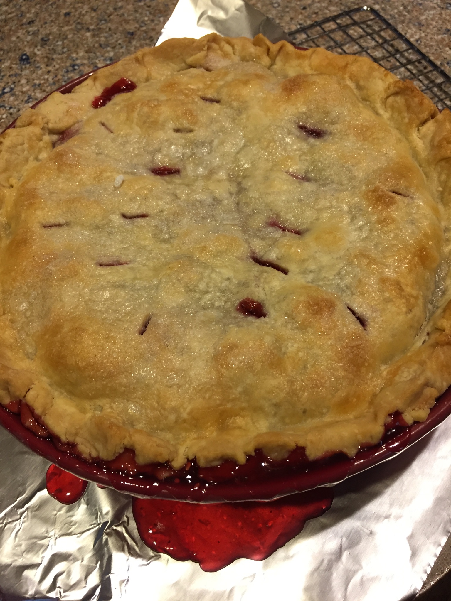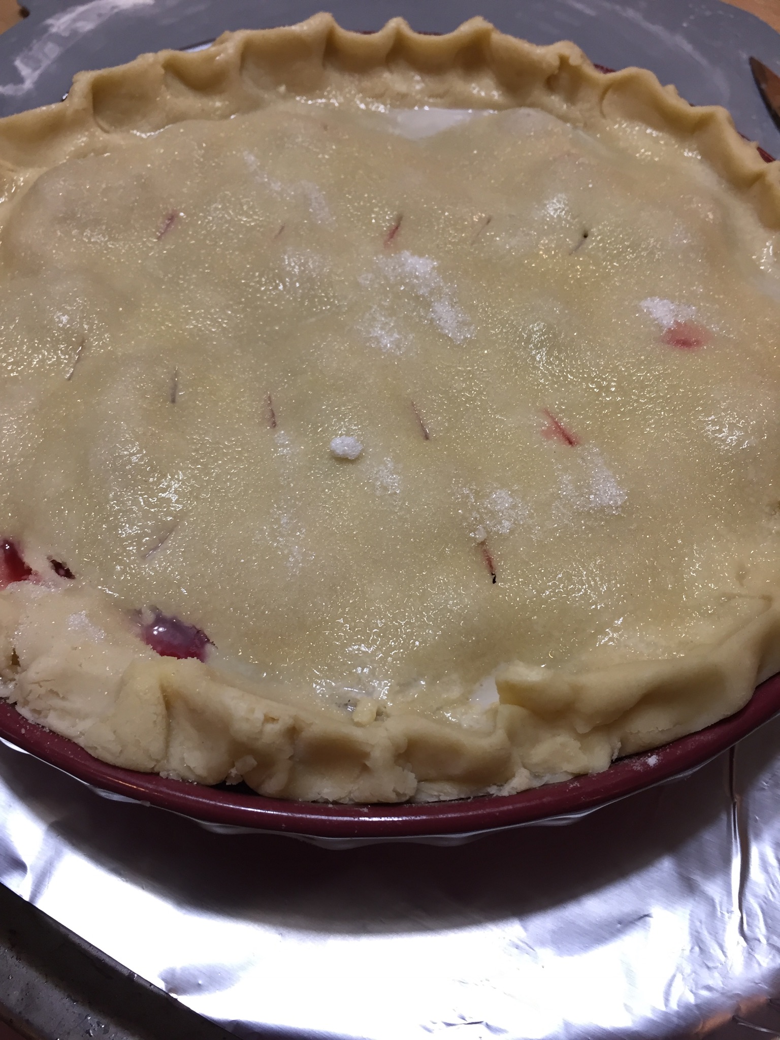 Roll out the top crust, cut slits with a paring knife, and crimp the edges. Sprinkle with a little white sugar. Bake for 50-55 minutes until the fruit is bubbly and the crust is golden brown. To avoid drips in your oven put the pie on a cookie sheet lined with foil.