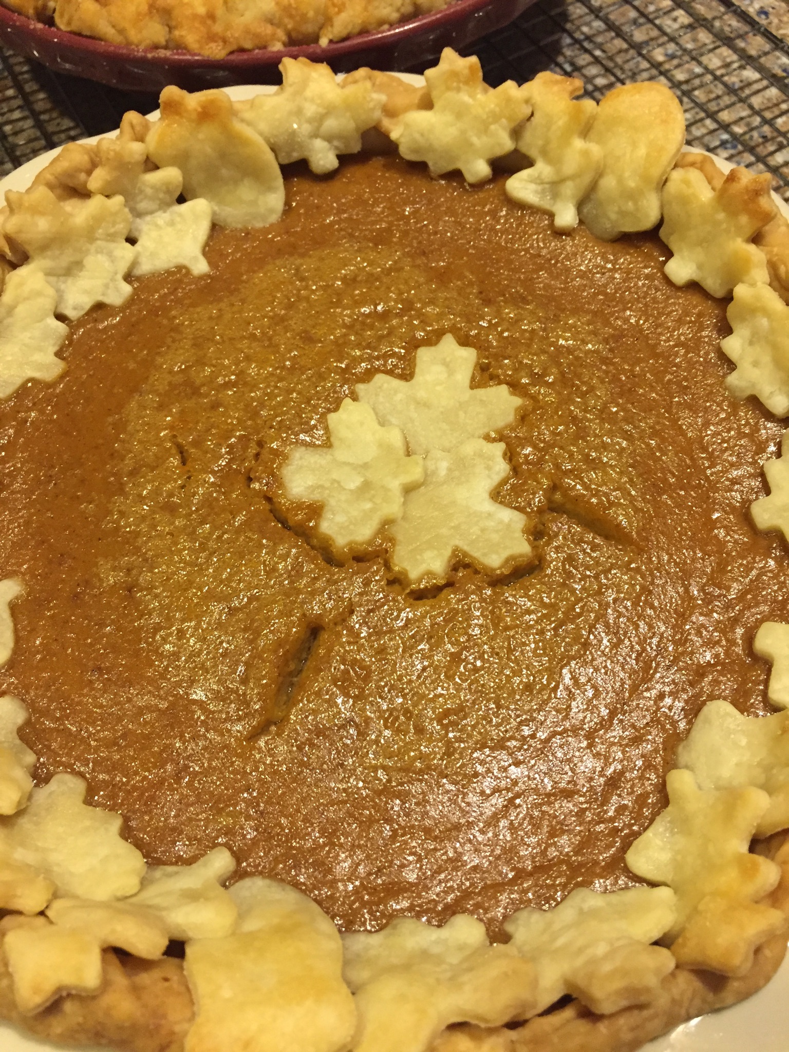 I had scraps of crust left over so I copied a friend’s idea and cut little leaves out with a cookie cutter and lined the edge. I actually had to add the fancy crust pieces part way through the baking process because the filling is too runny initially. Bake for 40 minutes or until a knife inserted 1 inch from the crust comes out clean.