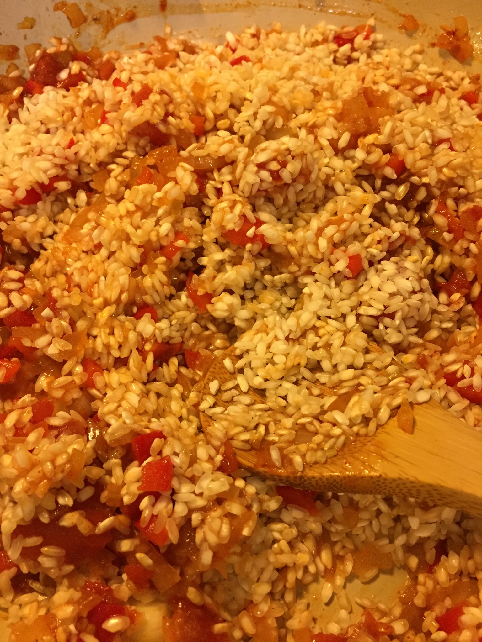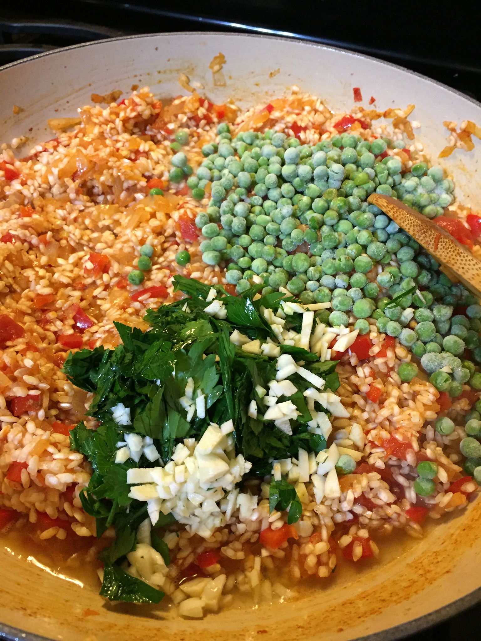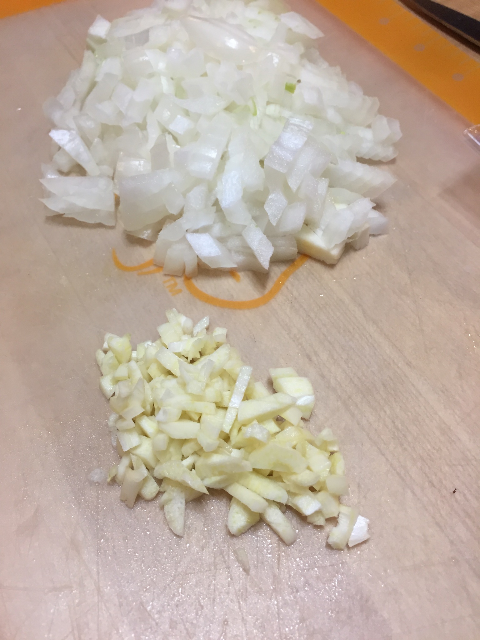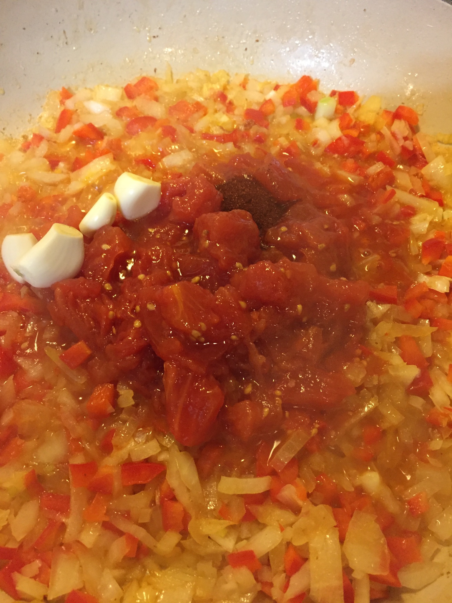 Heat the oil in a heavy skillet over medium heat and sweat the onions, garlic and spices together for a few minutes until the onions are tender.