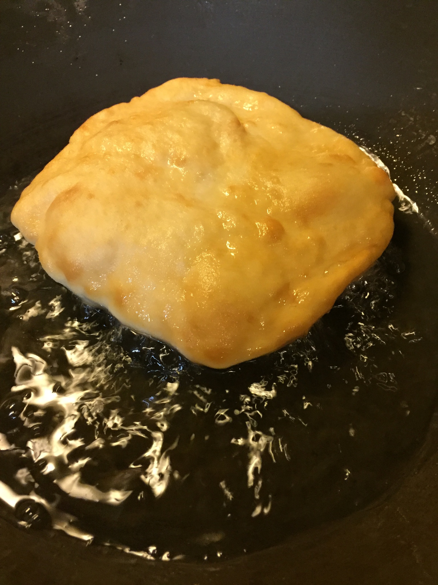 Drop the discs, one at a time, into the hot oil. Cook a couple minutes on each side until the fry bread is golden brown.