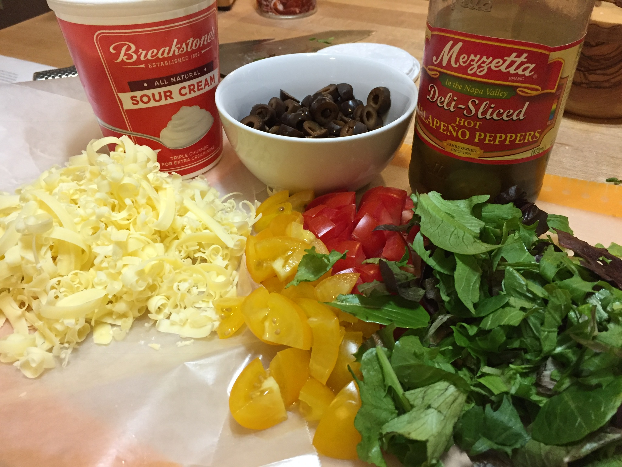 Get your favorite toppings ready so that you can assemble and serve the tacos. I used shredded sharp cheddar cheese, diced tomatoes, shredded lettuce, black olives, jalapeño and sour cream. Well, no jalapeños on mine. You could also use diced onion and salsa. Avocado is my favorite topping but I did not have any.