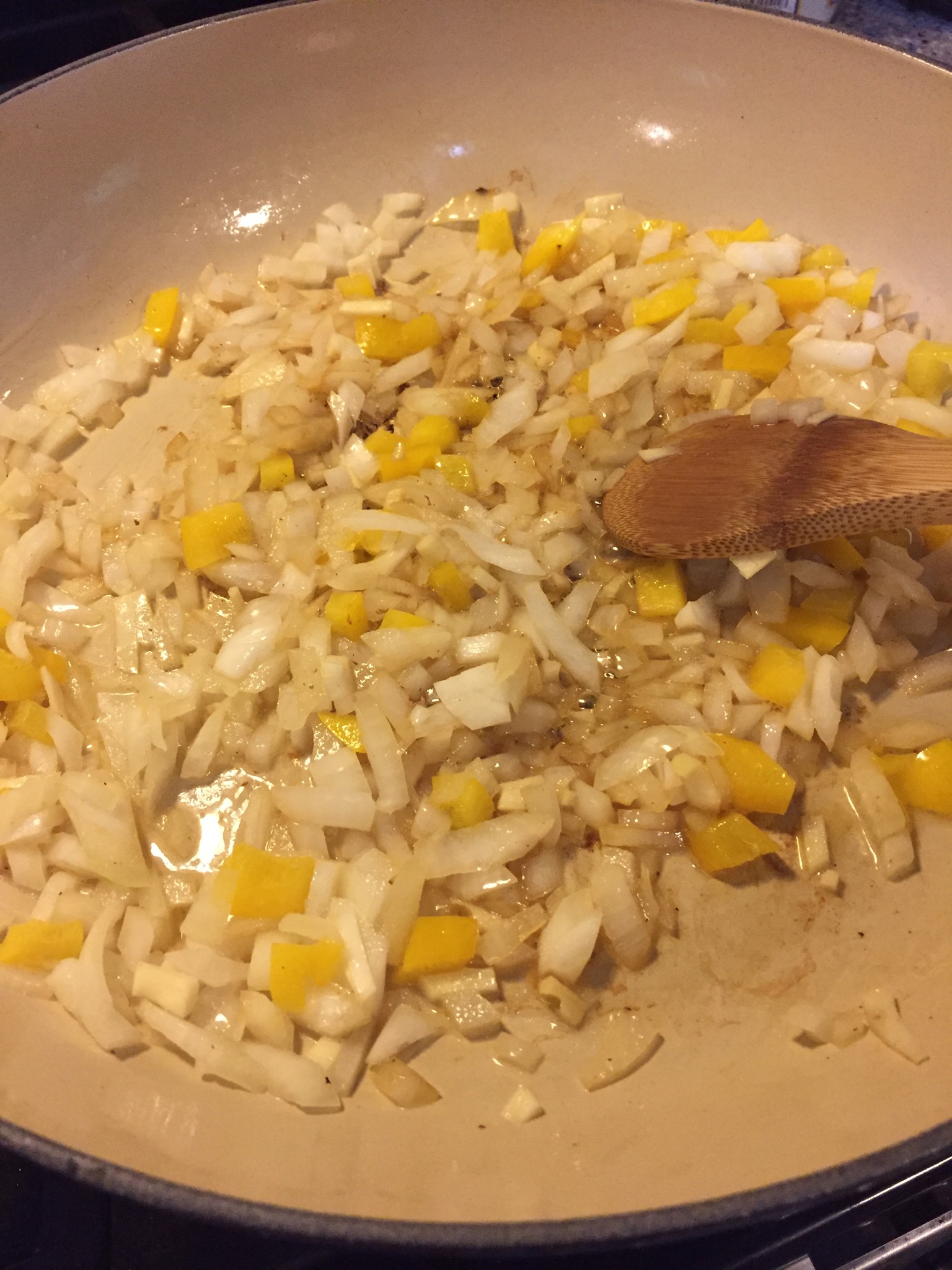 Add the onion, pepper and garlic to the bacon grease and cook over medium heat until tender but not brown. Two to three minutes.