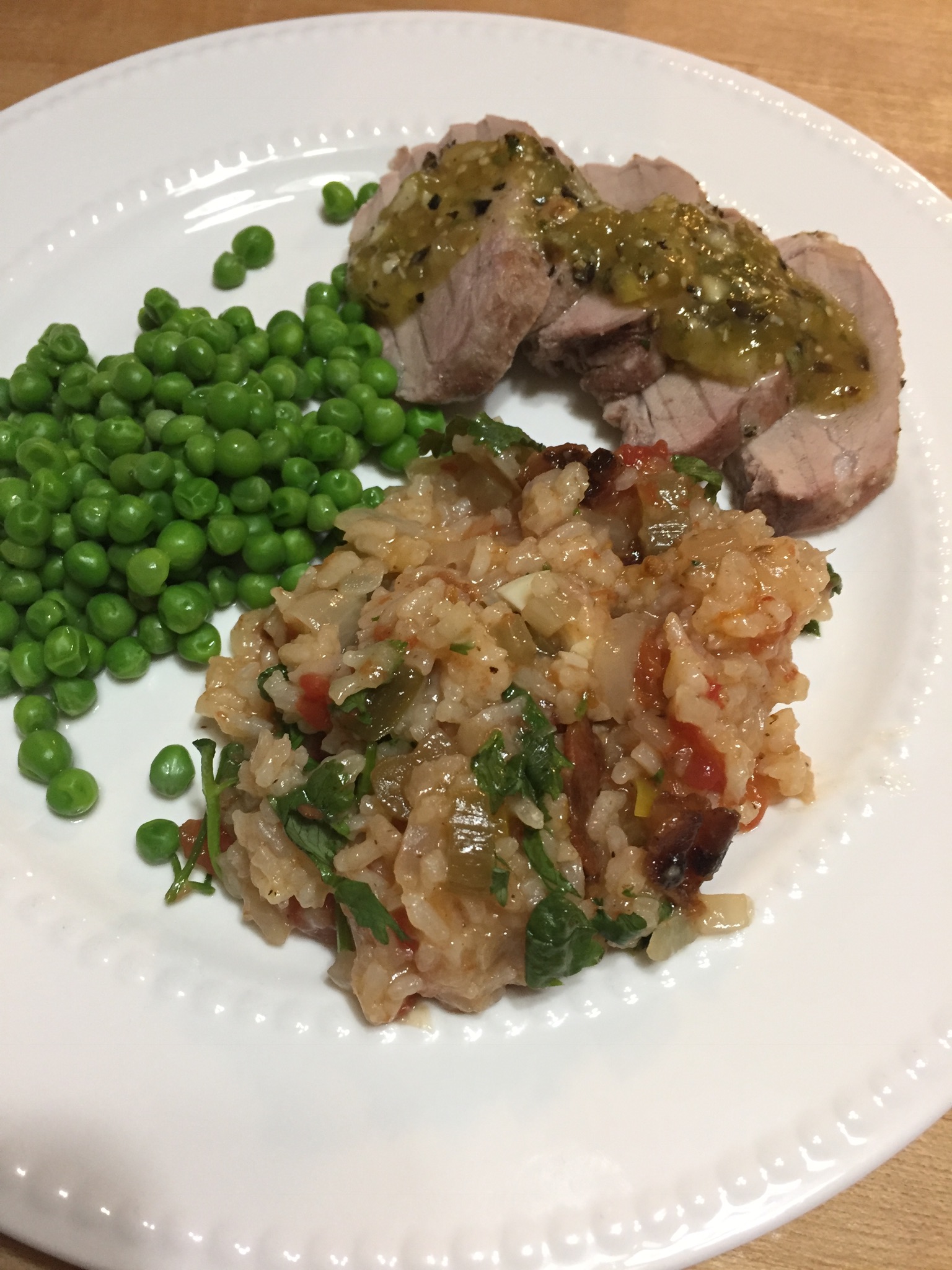 Pork Loin with Tomatillo Salsa and Spanish Rice. That was last nights supper. (You can find the recipe for Roasted Tomatillo Salsa in an earlier post.)