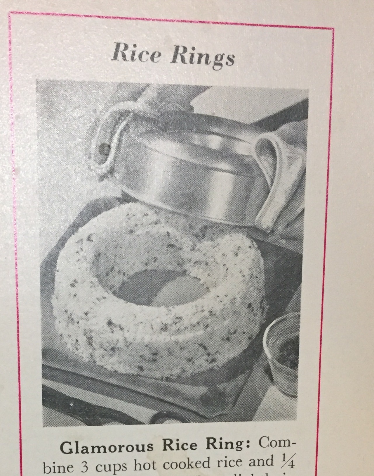 We all either own one of these books or have seen them in antique shops. The Spanish Rice recipe is listed next to the Cantonese Casserole which calls for frozen French style green beans, soy sauce, sour cream, cubed ham and water chestnuts topped with buttered soft bread crumbs and then baked. I never did make Cantonese Casserole. On the opposite page are Glamorous Rice Rings…which call for pressing hot cooked rice with chopped canned pimientos and peas into a ring mold.