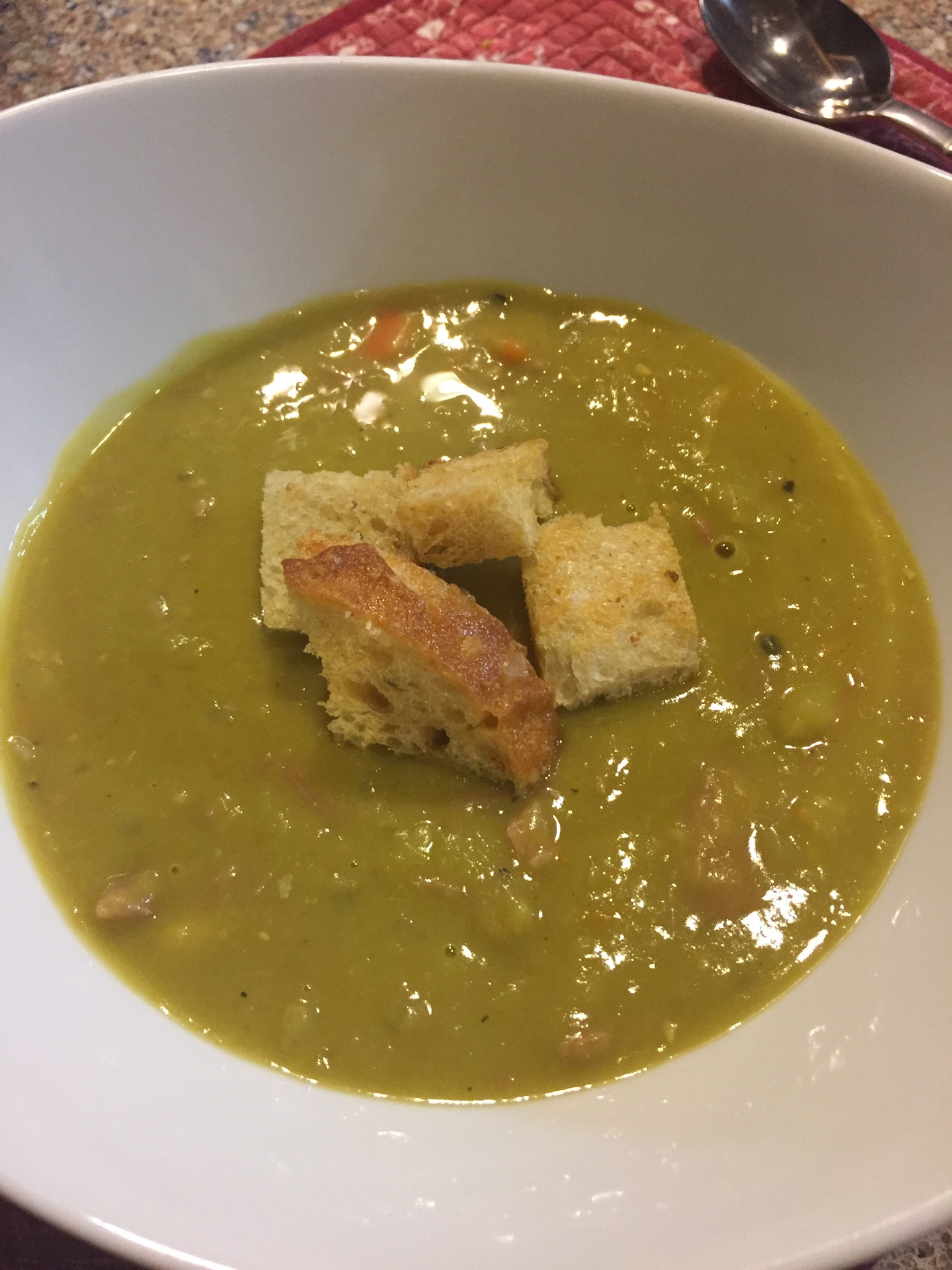 I added 2 more cups of chicken broth at this point. Leave the pressure cooker setting on warm until you’re ready to serve. Ladle into bowls and serve with homemade croutons or crusty bread. Maybe the next time I make pea soup I’ll whip up some heavy cream and stir a good size dollop in each bowl. And put the spicy mustard out for an authentic Finn bite.