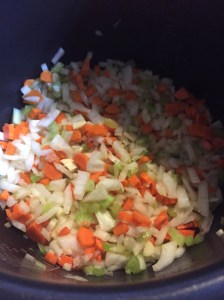 Heat the 3 tablespoons of butter in the pressure cooker using the saute setting. Saute the onion, carrots, and celery for 2-3 minutes until tender. Add the garlic and saute for another minute.
