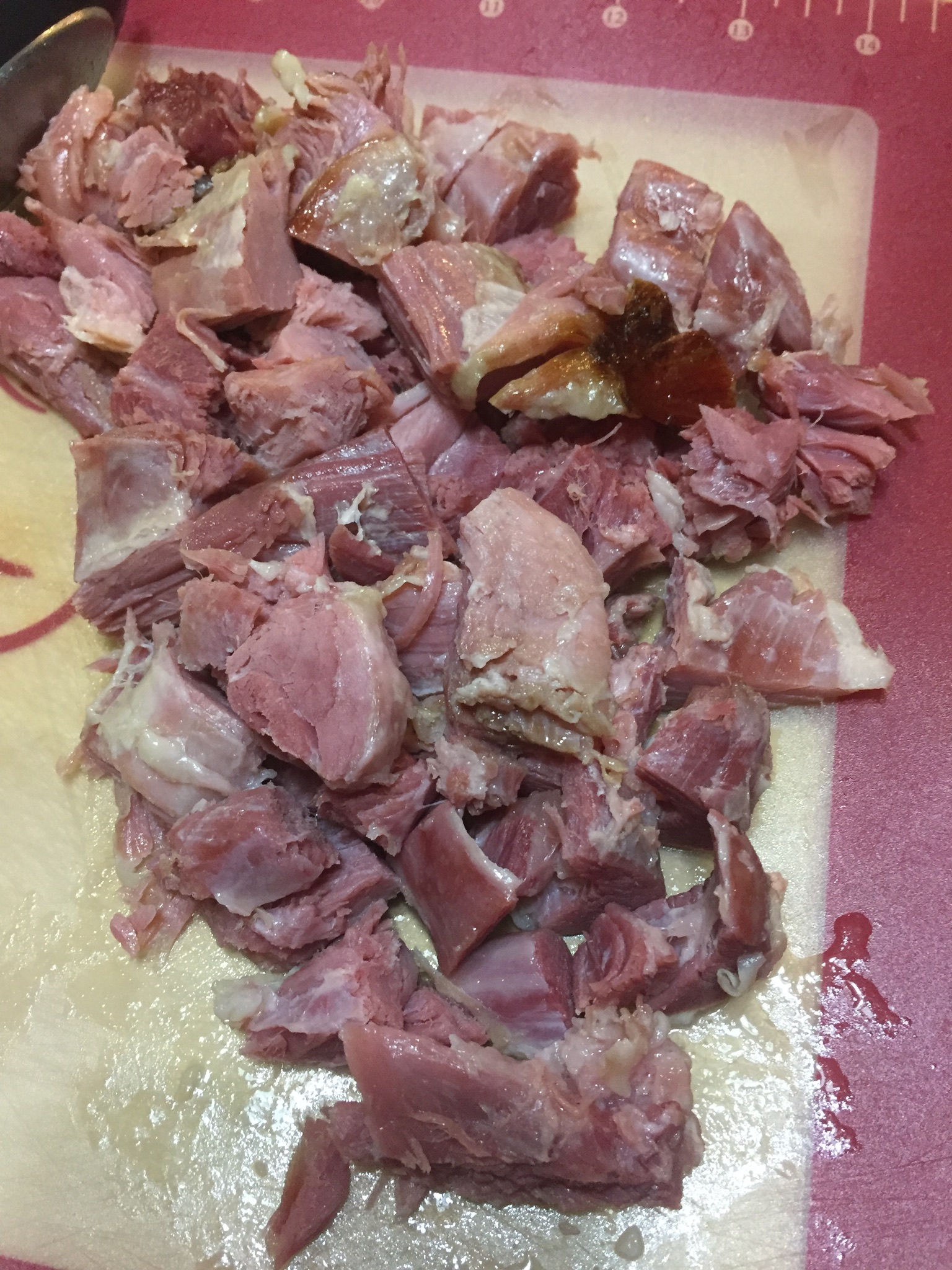 I used my electric pressure cooker which I think works great for dishes like this. I put the pork hock in the cooker, added 4 cups of water and set it on high pressure for 20 minutes and allowed the cooker to release naturally.