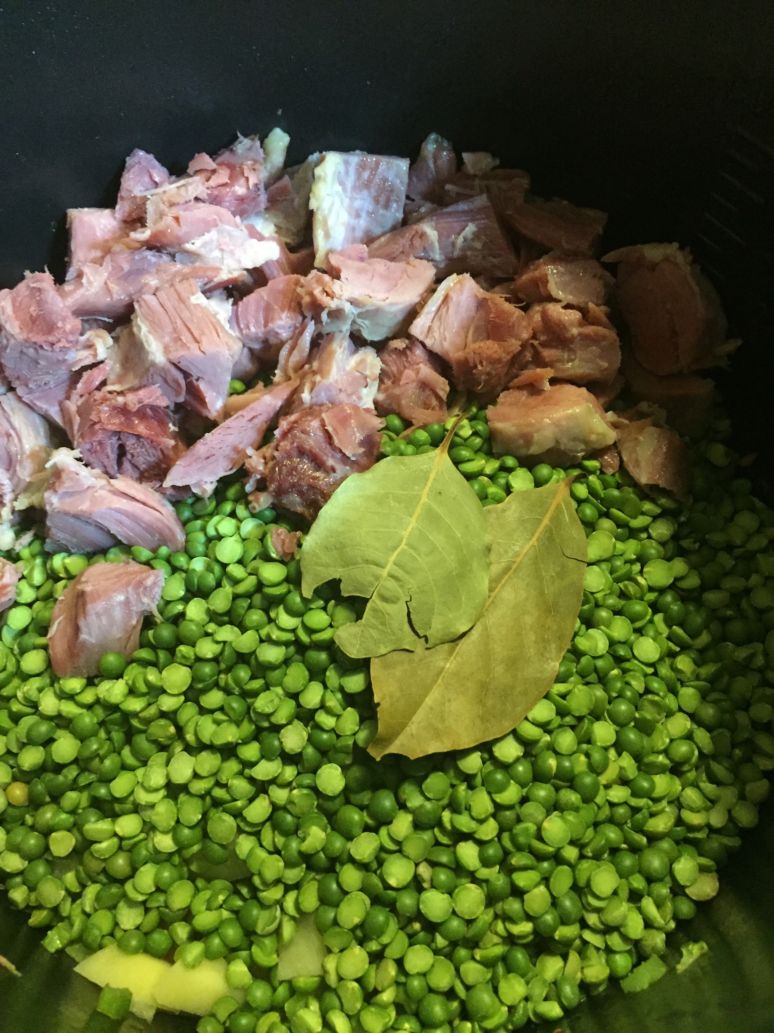 Add the peas that you’ve rinsed well, the bay leaves, the 4 cups of pork broth and 2 cups of the chicken broth.