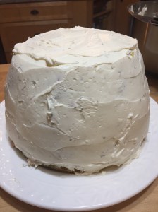 When you begin icing the sides and top of the cake do just as you would with a real cake. Start with a thin layer of icing to seal in the crumbs and then go back and add more icing and smooth out the sides and top.