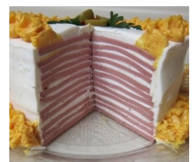 We have a good friend who requested a bologna cake for his birthday. He sent a photo of a bologna cake that was slice of bologna, cream cheese, slice of bologna, cream cheese and so on and so on. The sides and top were “frosted” with more cream cheese and decorated with the cheddar cheese that you buy in aerosol cans.
