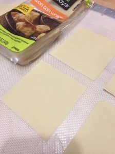 So I still had about 20 gnudi balls and I need to rethink this.  I happen to have wonton wrappers in the refrigerator so I decided to try cutting the balls in half and making them into ravioli.
