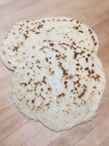 Once you’ve made the rounds, dry fry them (using no oil) about 1 minute per side in a heavy skillet. They will puff up a bit and be flecked with brown spots. I think cast iron works the best for the dry frying. I used my cast iron pizza pan which is one of my favorite pieces of cast iron. (Thank you Lodge). I let my pan heat over a medium flame for a few minutes before I started cooking the bread. Adjust the flame if the bread is cooking too quickly or too slowly. Too slowly and they will be dry, too quickly and they will be raw inside. I divided one of my eight balls into two smaller balls, rolled those out, and used them to “test” my griddle temperature.