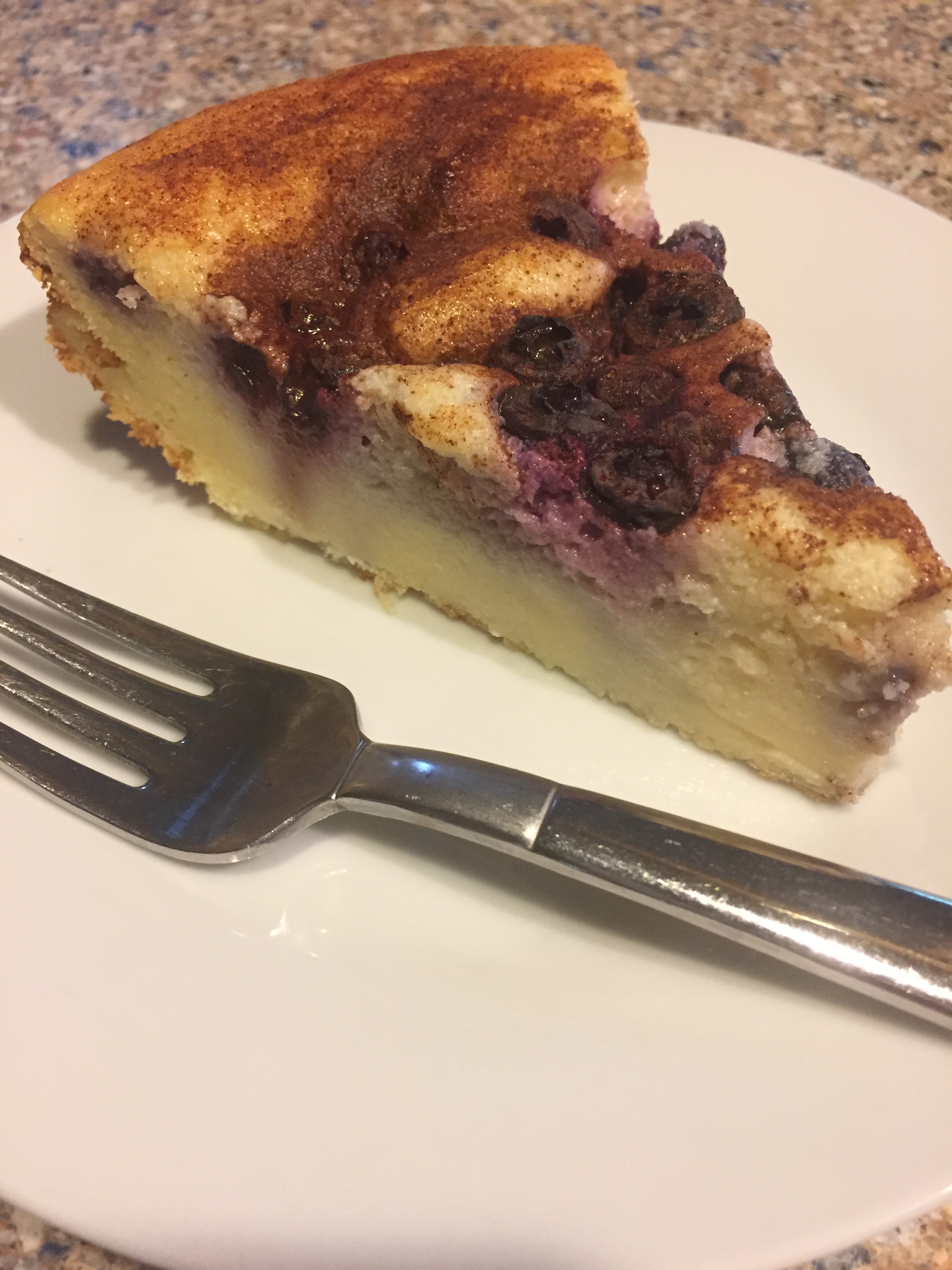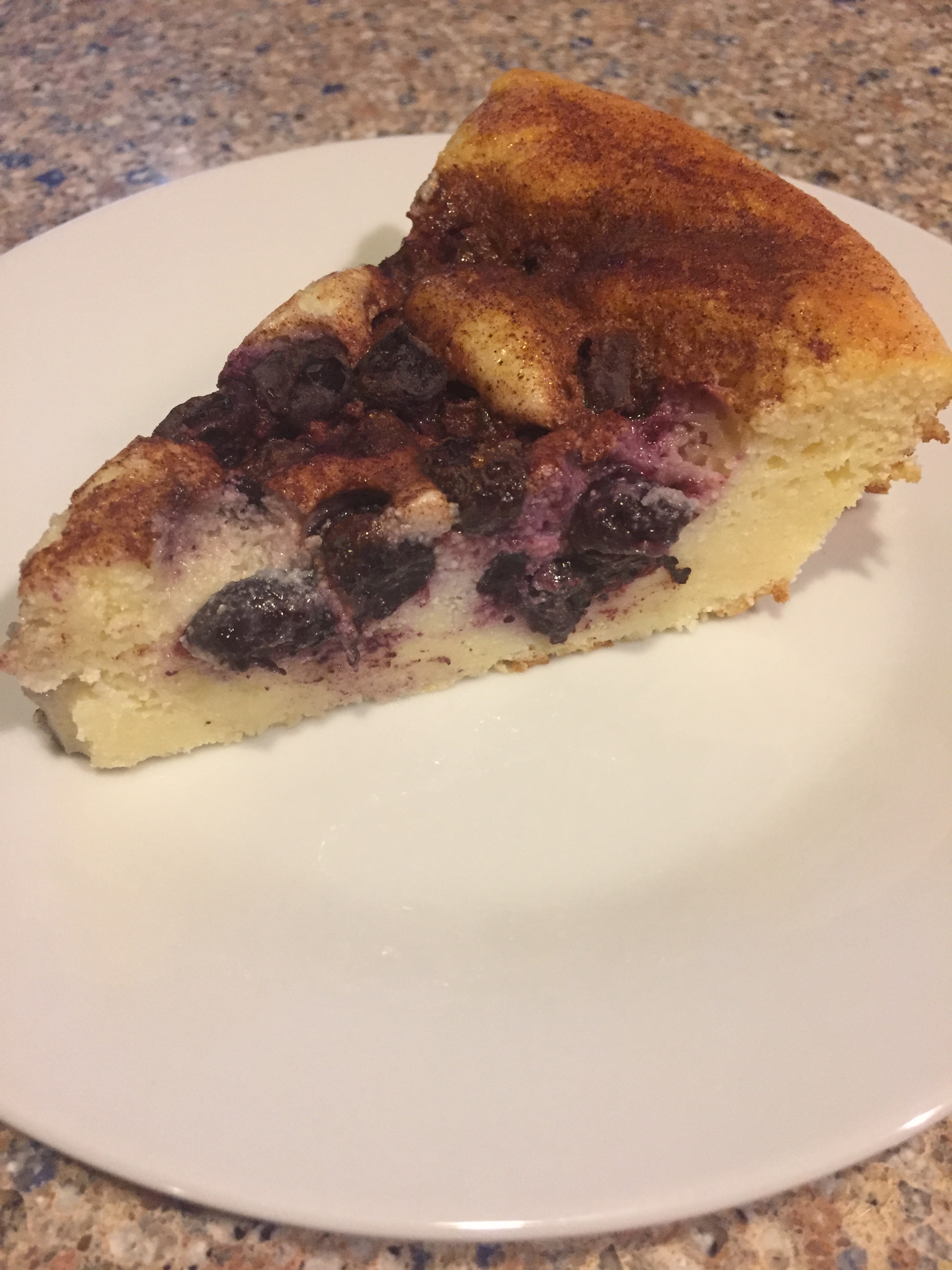 NOTE”. I baked mine in a 9” round pan for 45 minutes. I recommend checking it after 40 minutes. Much depends on your oven and the size of your pan. I will try this with a combination of apple and cranberries next. A little bit of sweet and tart together. Also, the cinnamon sugar is optional. Instead you might want to lightly dust with powdered sugar as you serve it or make a glaze and drizzle a little over the cake.