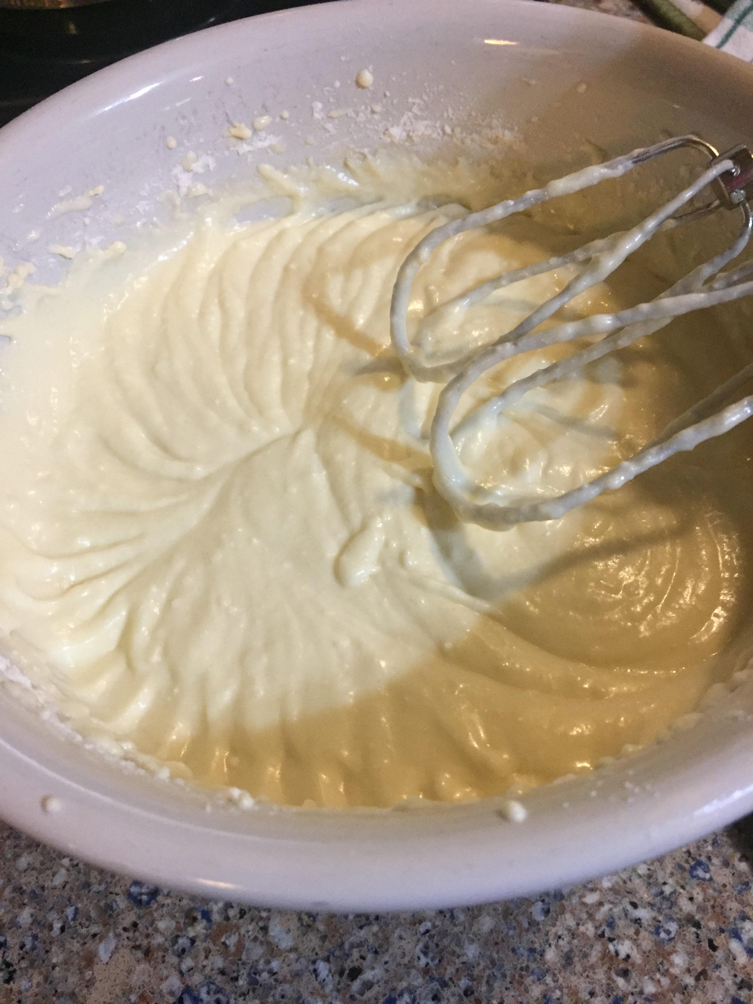 Add the melted butter, cottage or ricotta cheese, sour cream and vanilla. Beat until well combined.