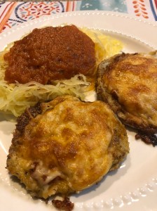 While your sauce is simmering, prepare your spaghetti squash. Preheat your oven to 375. I came across this hack for preparing spaghetti squash a few years ago in one of my food magazines. It is easier to remove the seeds, cooks more evenly and makes longer strands of spaghetti. Use a mister to coat a foil lined baking dish with olive oil. Cut the squash into 1to 1 1/2 inch thick slices. Use a paring knife to go around the inside edges and remove the seeds. Put the squash in the baking dish, spritz the top with olive oil, and bake for 45-50 minutes.