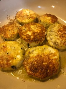 Heat the olive oil in a heavy skillet. Dip the eggplant rounds in the egg/cream mixture, then the cheese, then the seasoned flour. It’s not the usual order of things but it works in this recipe. Add the eggplant to the skillet and cook until browned on one side, flip to brown the other side, and remove to a platter.