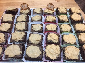 To make this cake easier to serve to a crowd I cut the cake, used cupcake lines to separate individual pieces, and then iced each piece. I made a peanut butter icing but you can use any flavor icing you like.