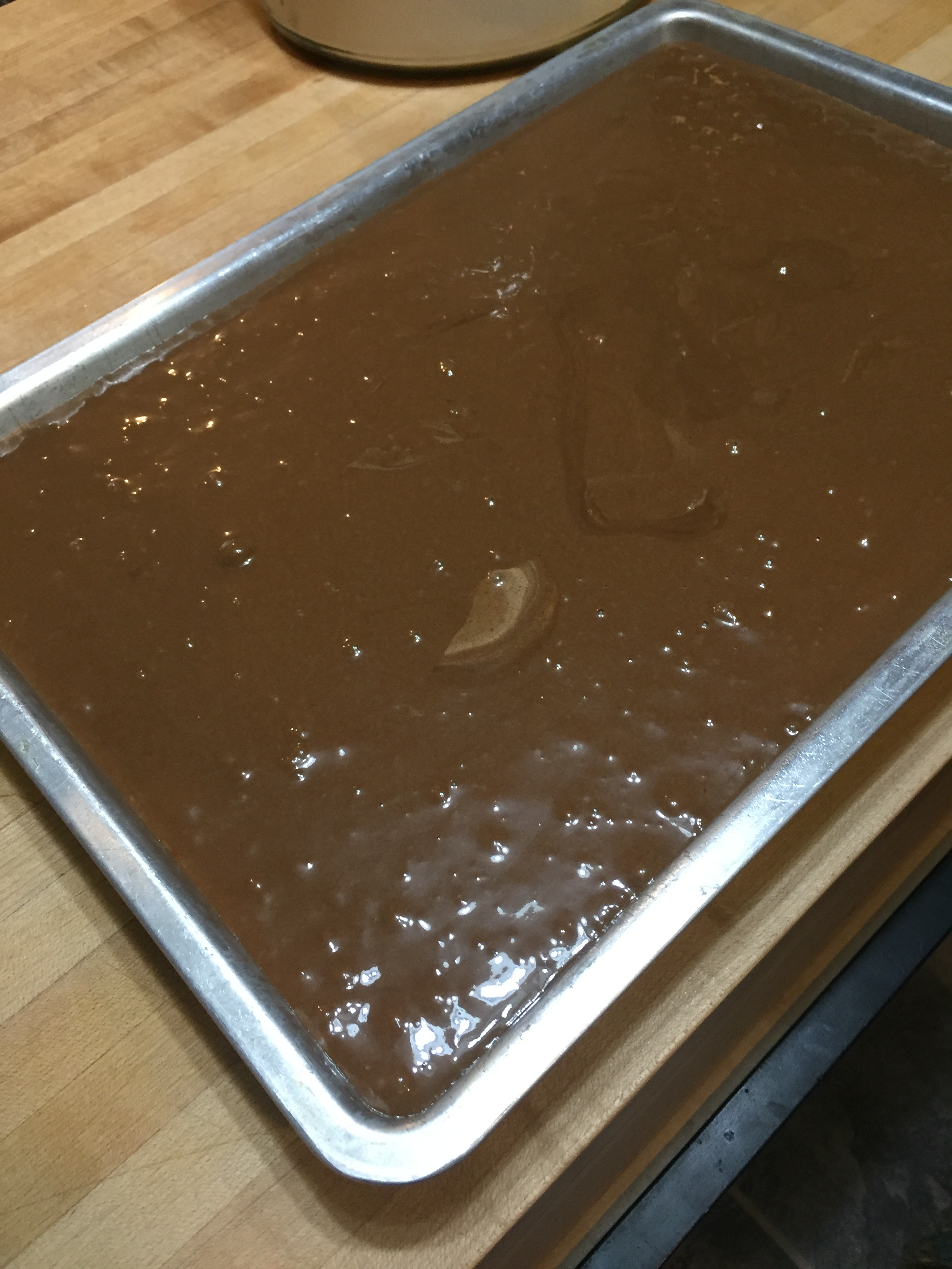 Pour the batter into a lightly greased and floured sheet pan. Bake for 22-25 minutes. Allow the cake to cool completely before icing.