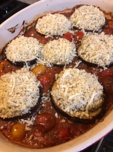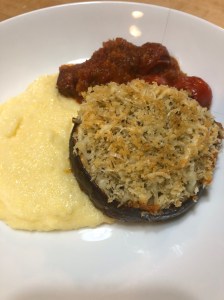 “Bowl” up and serve! A spoonful of polenta, an eggplant round, and a spoonful of sauce. Serve with fresh grated Parmesan. If you follow the recipe with my modifications you will have more sauce in your bowl than shown below.