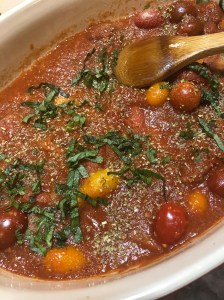 The recipe called for canned cherry tomatoes. I have personally never seen canned cherry tomatoes but they did give a pro tip for substituting fresh cherry tomatoes. The recipe called for 1 pint of fresh cherry tomatoes, 2 T tomato paste and 2 T of water simmered together until the tomatoes begin to wilt. I recommend doubling the amount of tomatoes to 2 pints and doubling the water to 1/4 cup. Two tablespoons of tomato paste is plenty. I almost always buy small heirloom tomatoes and those worked just fine.