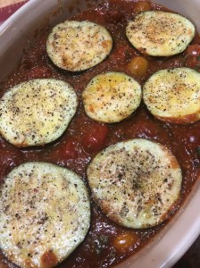 Cut your eggplant into 1 inch thick rounds and nestle them in among the tomatoes.