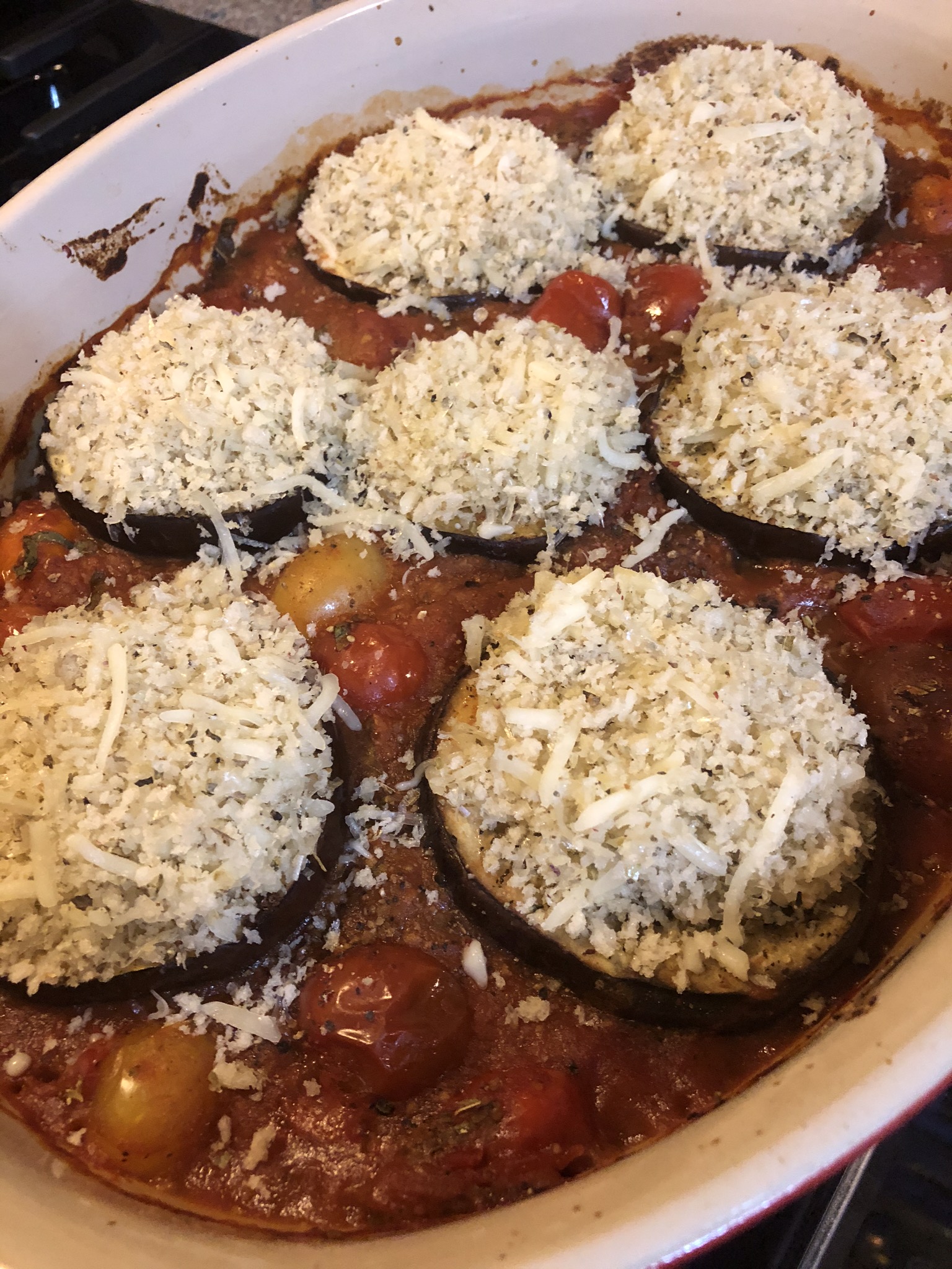 Bake for 25-30 minutes until the eggplant rounds are tender. While the casserole is in the oven toss the panko, cheeses, salt, and dried herbs together with 2 T of olive oil in a medium bowl.