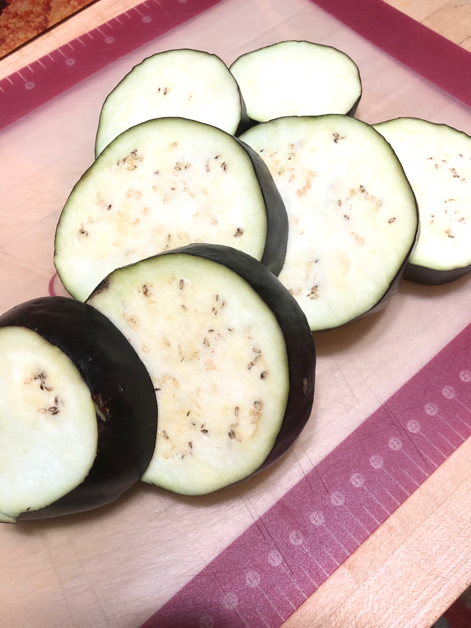 Cut your eggplant into 1 inch thick rounds and nestle them in among the tomatoes.