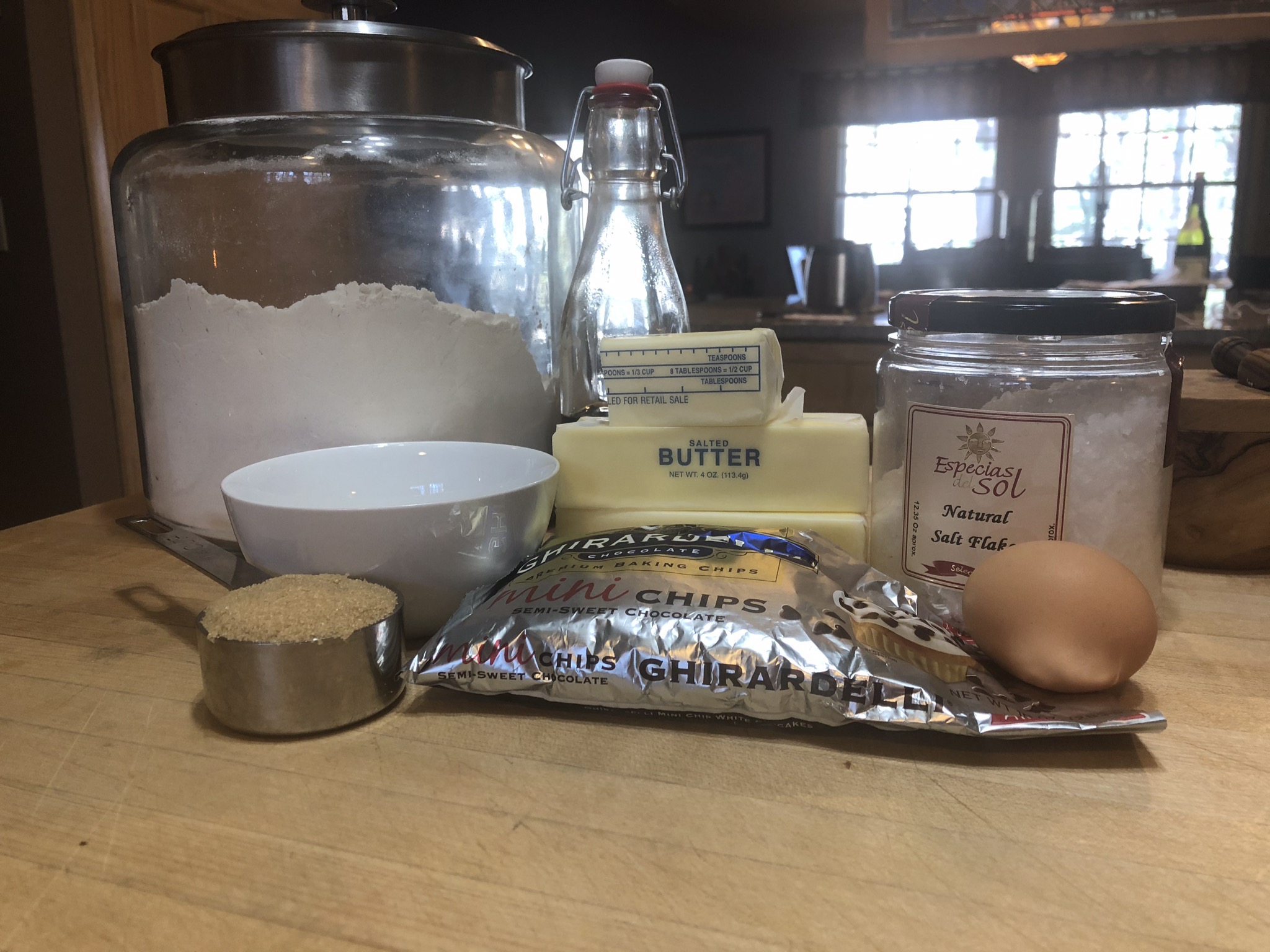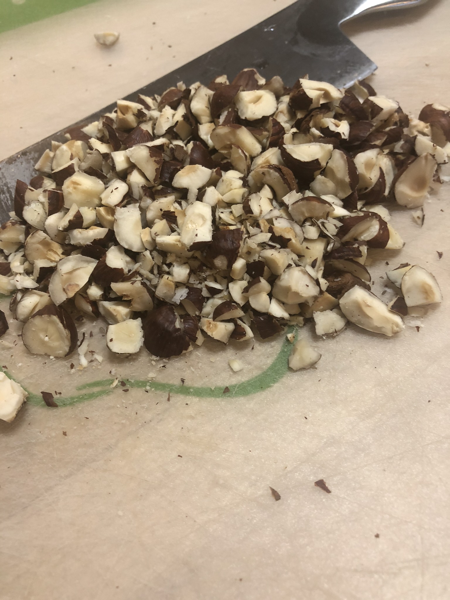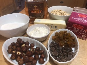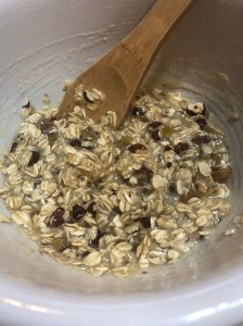 Preheat your oven to 400 and line a cookie sheet with parchment paper. Make sure your chocolate, nuts, and raisins are all chopped.
