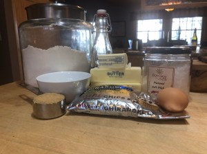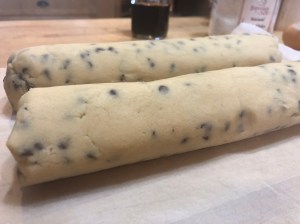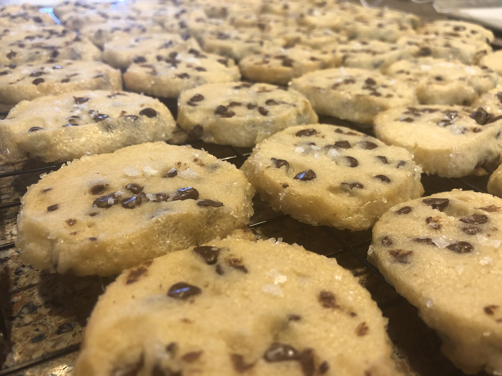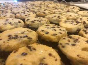 The book suggested creating shapes before the cookies have cooled by laying them over a cup (or small bowl) or draping them over a rolling pin and letting them set up. I think my inability to shape my cookies was a lack of patience. I slid the cookies off of the baking sheet and allowed them to cool on a wire rack making it difficult to even get them off the rack intact. Next time I will be more patient. The book also suggests storing them in an airtight container with greaseproof paper between each cookie. Mine remain “stored” on the wire cooling rack and they get munched on as we walk by.