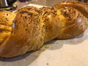 Challah is a special bread in Jewish cuisine.  It’s usually braided and is typically eaten on Jewish holidays and the sabbath.  I am told that the three strands of the braid symbolize truth, peace, and justice.  And the poppy seeds are said to symbolize the manna that fell from heaven.  Challah is very similar to a Finnish bread called Pulla which is what I grew up eating.  In fact, in one of my very favorite bread books, the breads are listed together along with the exchanges.  For pulla milk vs. water, sugar vs. honey, and the addition of cardamom seed.  Since this pandemic started, and as we have sheltered at home, I’ve been doing a lot more baking than usual.  There are only two of us sheltering in this house and I’m working on my fifth five pound bag of flour.  My daughter and son-in-law, also sheltering at home, have been doing as much bread baking as me, maybe more.  I recently had a copy of my fav bread book sent to them.