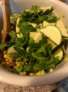 NOTE:  Obviously, if you prefer, and if you can find them, you could cook the dried black eyed peas and add them to the salad.  The recipe calls for 8 oz. of dried beans (about 1cup).  Or, if you can find traditional vs the southern style black eyed peas, that would work as well.  Although, I must say, the smoky taste worked for me.  If you prefer you could use different beans altogether…lima, canary, navy, pinto.